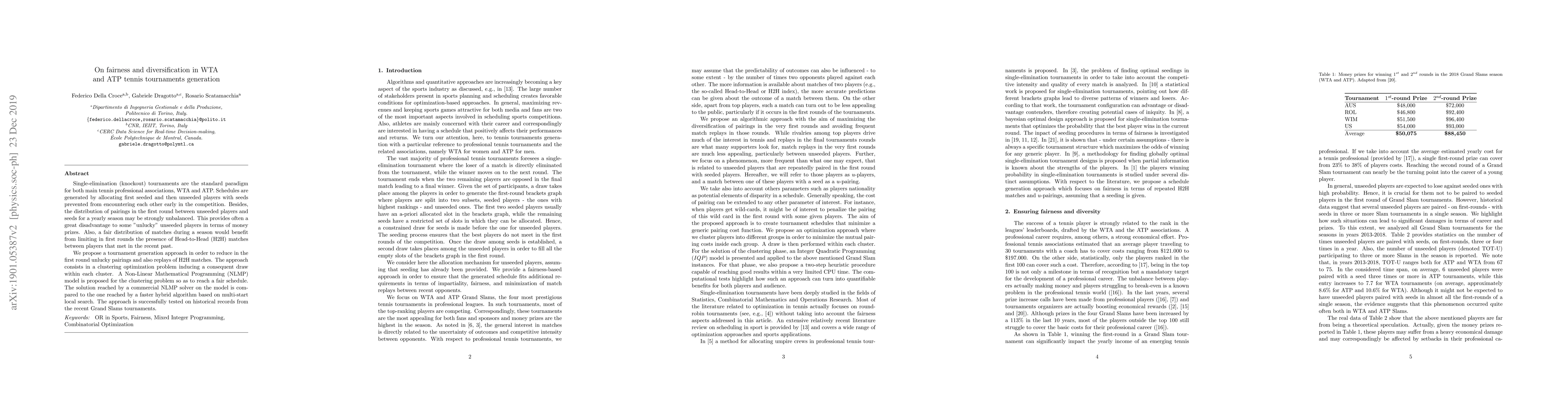 Single-elimination tournaments are the standard paradigm both for the main tennis professional associations. Schedules are generated by allocating first seeded and then unseeded players with seeds prevented from encountering each other early in the competition. Besides, the distribution of pairings in the first round between unseeded players and seeds for a yearly season may be strongly unbalanced. This provides often a great disadvantage to some "unlucky" unseeded players in terms of money prizes. Also, a fair distribution of matches during a season would benefit from limiting in first rounds the presence of Head-to-Head (H2H) matches between players that met in the recent past. We propose a tournament generation approach in order to reduce in the first round "unlucky" pairings and replay of H2H matches. The approach consists in a clustering optimization problem inducing a consequent draw within each cluster. A Non-Linear Mathematical Programming (NLMP) model is proposed for the clustering problem so as to reach a fair schedule. The solution reached by a commercial NLMP solver on the model is compared to the one reached by a faster hybrid algorithm based on multi-start local search. The approach is successfully tested on historical records from the recent Grand Slams tournaments.