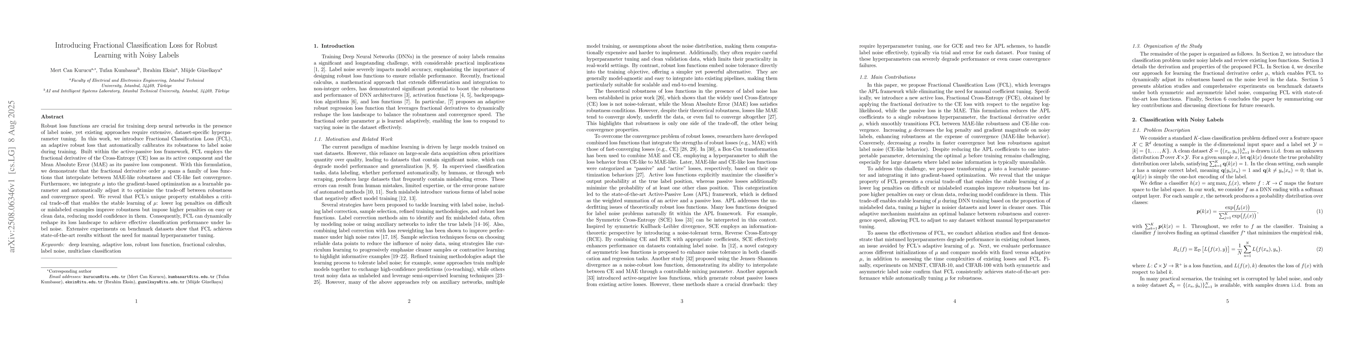 Robust loss functions are crucial for training deep neural networks in the presence of label noise, yet existing approaches require extensive, dataset-specific hyperparameter tuning. In this work, we introduce Fractional Classification Loss (FCL), an adaptive robust loss that automatically calibrates its robustness to label noise during training. Built within the active-passive loss framework, FCL employs the fractional derivative of the Cross-Entropy (CE) loss as its active component and the Mean Absolute Error (MAE) as its passive loss component. With this formulation, we demonstrate that the fractional derivative order $\mu$ spans a family of loss functions that interpolate between MAE-like robustness and CE-like fast convergence. Furthermore, we integrate $\mu$ into the gradient-based optimization as a learnable parameter and automatically adjust it to optimize the trade-off between robustness and convergence speed. We reveal that FCL's unique property establishes a critical trade-off that enables the stable learning of $\mu$: lower log penalties on difficult or mislabeled examples improve robustness but impose higher penalties on easy or clean data, reducing model confidence in them. Consequently, FCL can dynamically reshape its loss landscape to achieve effective classification performance under label noise. Extensive experiments on benchmark datasets show that FCL achieves state-of-the-art results without the need for manual hyperparameter tuning.