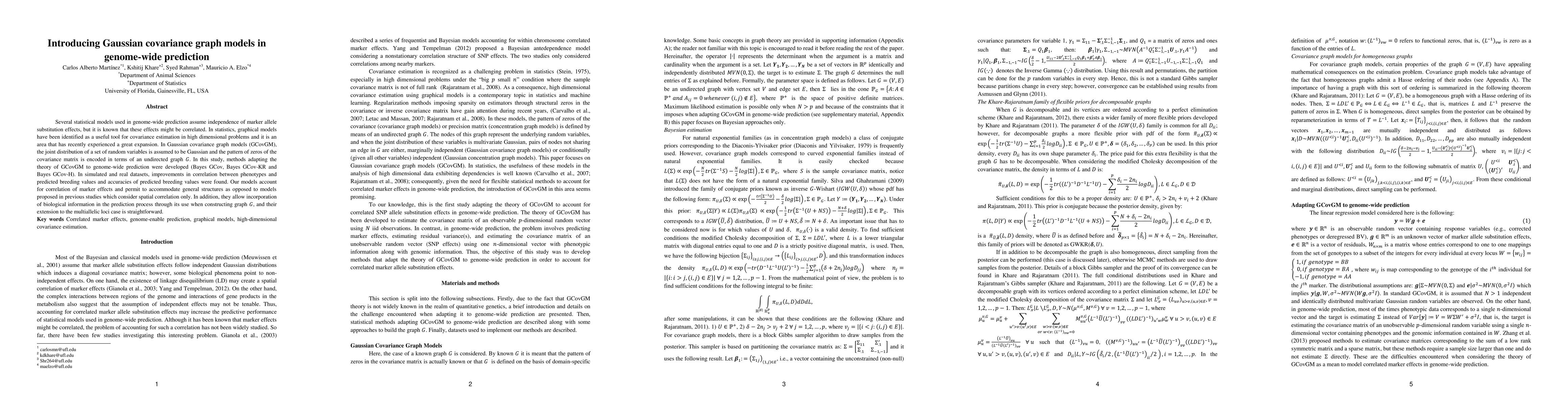 This study introduces Gaussian covariance graph models (GCovGM) for genome-wide prediction, adapting the theory to account for correlated marker allele substitution effects. The proposed Bayes GCov, Bayes GCov-KR, and Bayes GCov-H models show improved prediction accuracy and accommodate general correlation structures compared to previous models.