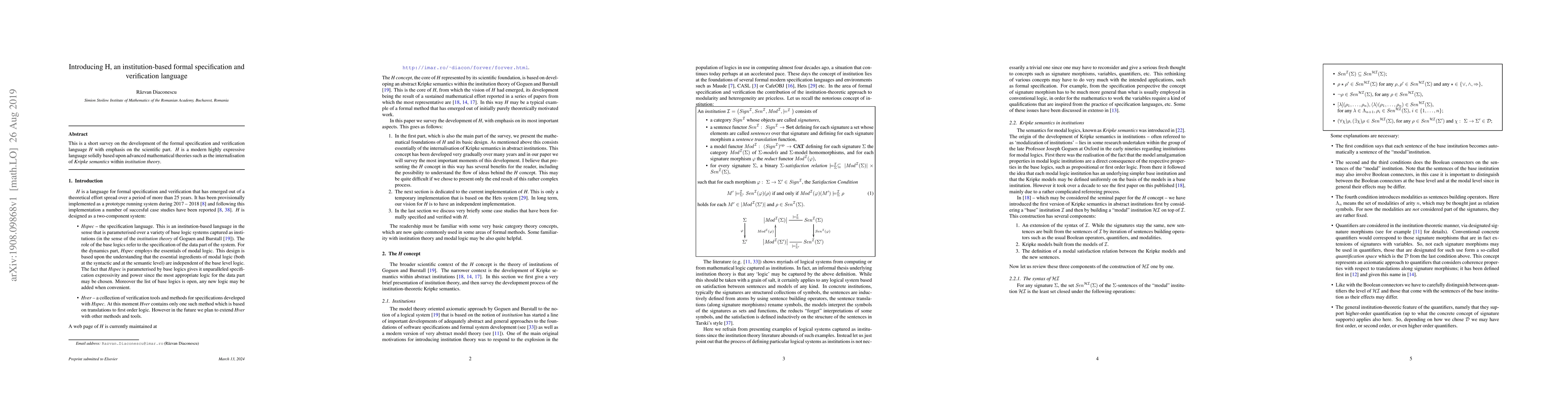 Summary: This paper surveys the development of H, a formal specification and verification language grounded in advanced mathematical theories, particularly focusing on its expressiveness and the integration of Kripke semantics within institution theory.
