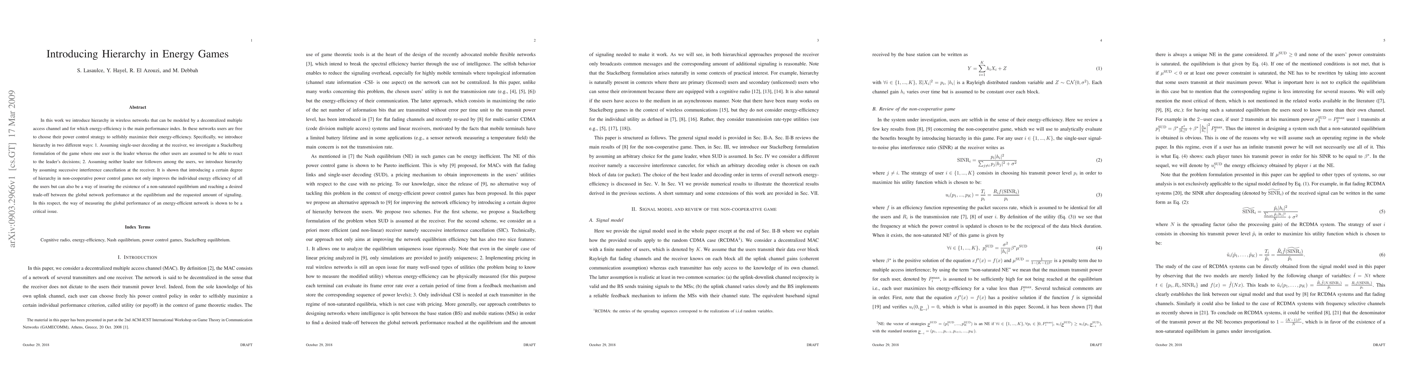 This paper introduces hierarchy in wireless networks to improve energy efficiency and network performance through non-cooperative power control games, revealing a critical need for global performance measurement.