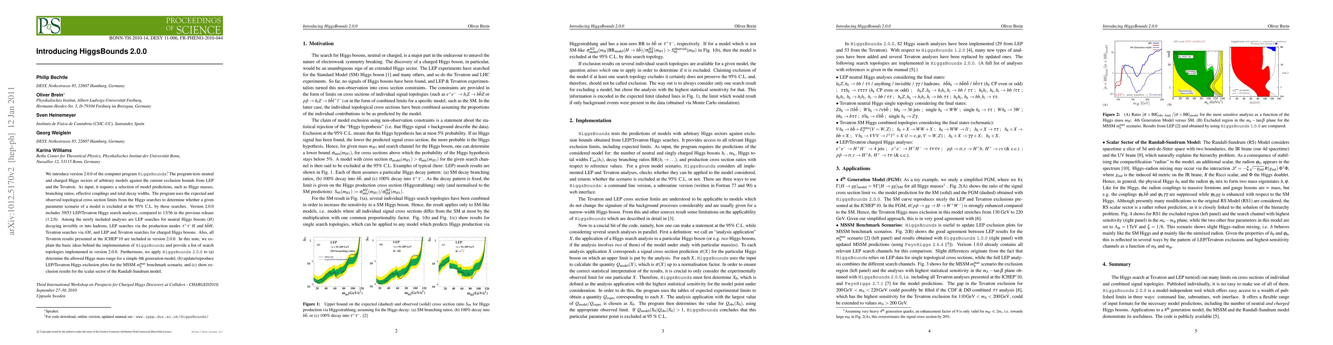 We introduce version 2.0.0 of the computer program HiggsBounds. The program tests neutral and charged Higgs sectors of new models against the current exclusion bounds from LEP and the Tevatron. As input, it requires a selection of model predictions, such as Higgs masses, branching ratios, effective couplings and total decay widths. The program then uses the expected and observed topological cross section limits from the Higgs searches to determine whether a given parameter scenario of a model is excluded at the 95% C.L. by those searches. Version 2.0.0 includes 39/53 LEP/Tevatron Higgs search analyses, compared to 13/36 in the previous release (1.2.0). Among the newly included analyses are LEP searches for neutral Higgs bosons (H) decaying invisibly or into hadrons, LEP searches via the production modes (tau+ tau- H) and (b b-bar H), Tevatron searches via (t t-bar H), and LEP and Tevatron searches for charged Higgs bosons. Also, all Tevatron results presented at the ICHEP'10 are included in version 2.0.0. In this talk, we explain the basic ideas behind the implementation of HiggsBounds and provide a list of search topologies implemented in version 2.0.0. Furthermore, we apply HiggsBounds 2.0.0 to (a) determine the allowed Higgs mass range for a simple 4th generation model, (b) update/reproduce LEP/Tevatron Higgs exclusion plots for the MSSM m_h-max benchmark scenario, and (c) show exclusion results for the scalar sector of the Randall-Sundrum model.
