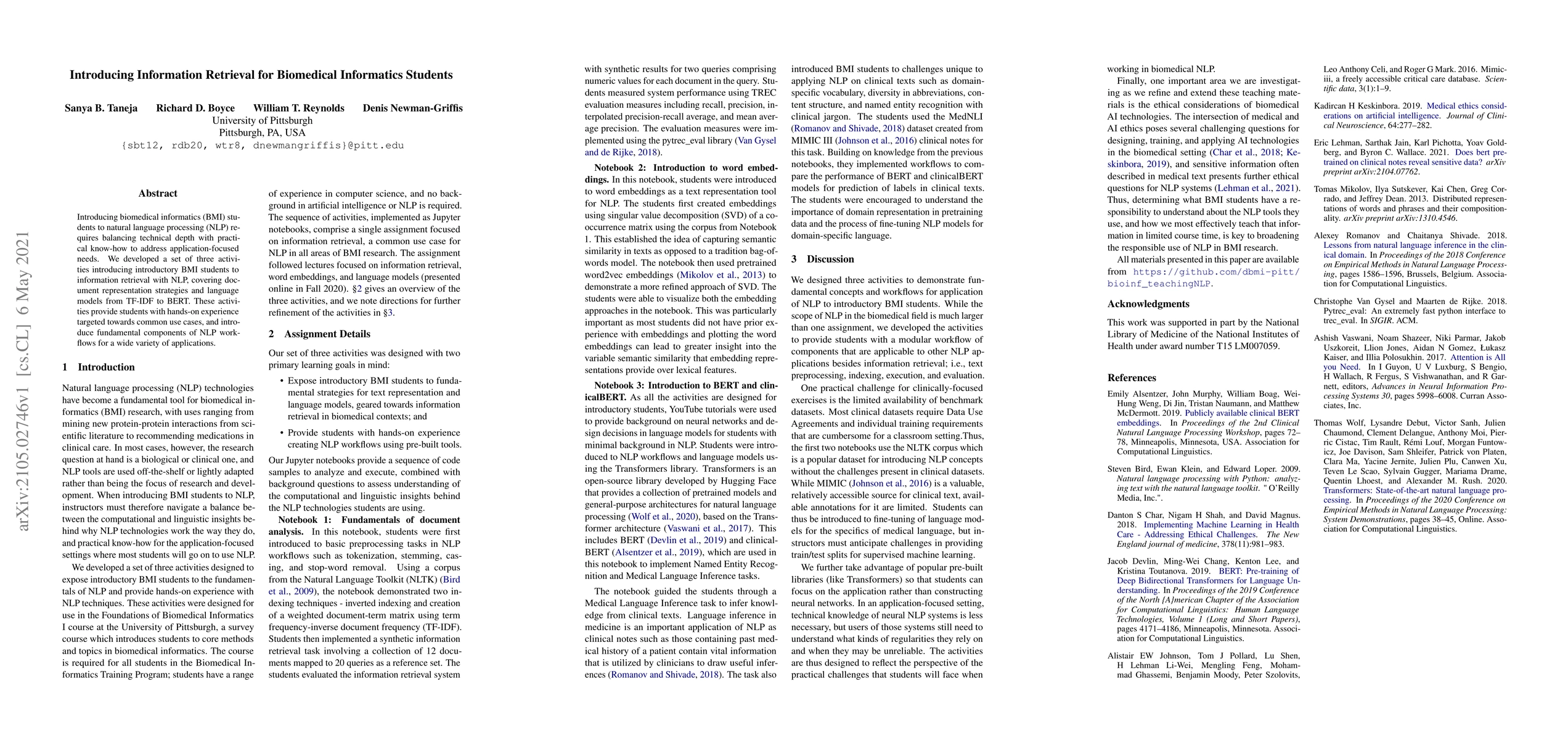 This paper presents three activities designed to introduce biomedical informatics students to information retrieval using natural language processing, focusing on document representation and language models from TF-IDF to BERT, to provide practical, hands-on experience in NLP workflows.