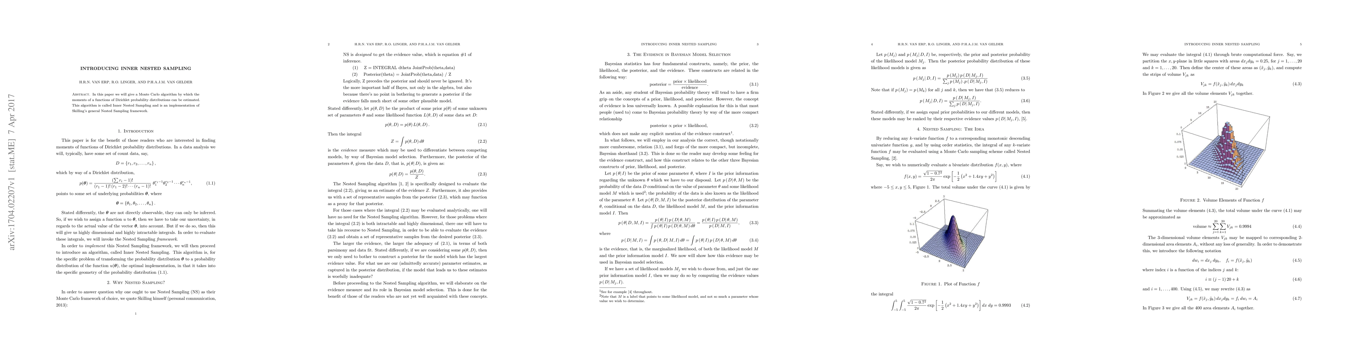 Summary: This paper introduces Inner Nested Sampling, a Monte Carlo algorithm for estimating moments of functions derived from Dirichlet probability distributions, implementing Skilling's Nested Sampling framework. The method aims to improve sampling efficiency in complex probabilistic models.