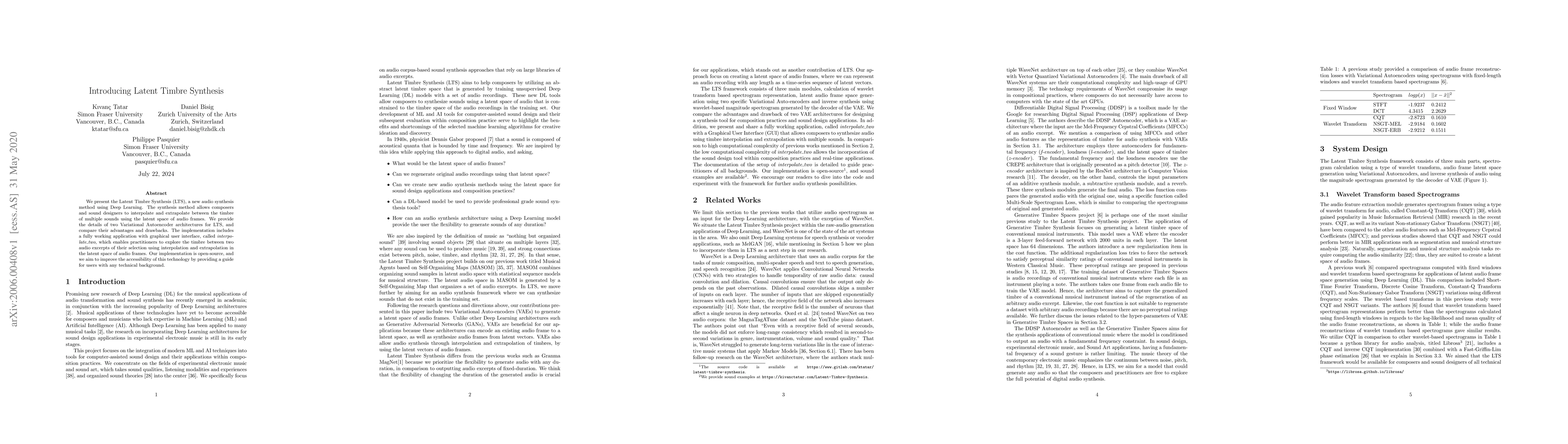 We present the Latent Timbre Synthesis (LTS), a new audio synthesis method using Deep Learning. The synthesis method allows composers and sound designers to interpolate and extrapolate between the timbre of multiple sounds using the latent space of audio frames. We provide the details of two Variational Autoencoder architectures for LTS, and compare their advantages and drawbacks. The implementation includes a fully working application with graphical user interface, called \textit{interpolate\_two}, which enables practitioners to explore the timbre between two audio excerpts of their selection using interpolation and extrapolation in the latent space of audio frames. Our implementation is open-source, and we aim to improve the accessibility of this technology by providing a guide for users with any technical background.