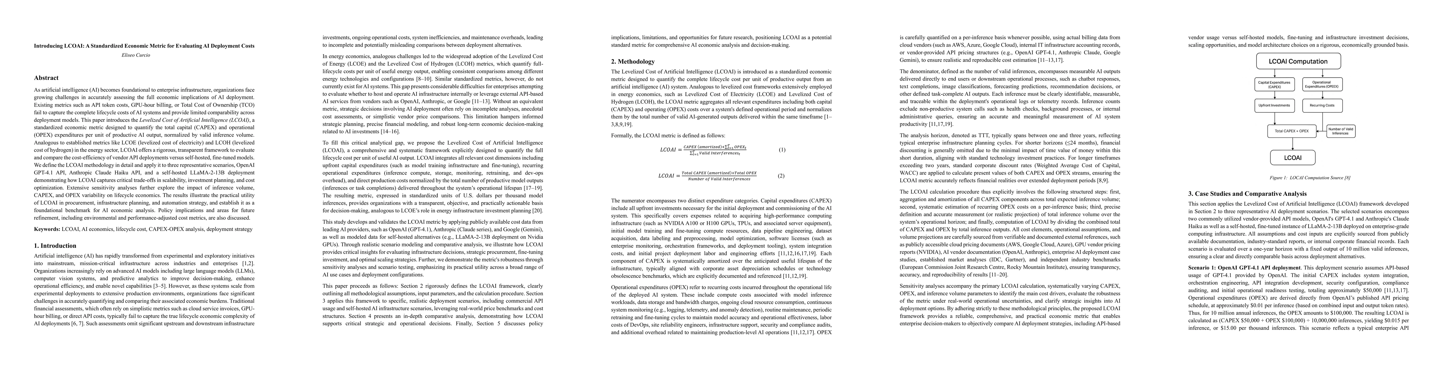 As artificial intelligence (AI) becomes foundational to enterprise infrastructure, organizations face growing challenges in accurately assessing the full economic implications of AI deployment. Existing metrics such as API token costs, GPU-hour billing, or Total Cost of Ownership (TCO) fail to capture the complete lifecycle costs of AI systems and provide limited comparability across deployment models. This paper introduces the Levelized Cost of Artificial Intelligence (LCOAI), a standardized economic metric designed to quantify the total capital (CAPEX) and operational (OPEX) expenditures per unit of productive AI output, normalized by valid inference volume. Analogous to established metrics like LCOE (levelized cost of electricity) and LCOH (levelized cost of hydrogen) in the energy sector, LCOAI offers a rigorous, transparent framework to evaluate and compare the cost-efficiency of vendor API deployments versus self-hosted, fine-tuned models. We define the LCOAI methodology in detail and apply it to three representative scenarios, OpenAI GPT-4.1 API, Anthropic Claude Haiku API, and a self-hosted LLaMA-2-13B deployment demonstrating how LCOAI captures critical trade-offs in scalability, investment planning, and cost optimization. Extensive sensitivity analyses further explore the impact of inference volume, CAPEX, and OPEX variability on lifecycle economics. The results illustrate the practical utility of LCOAI in procurement, infrastructure planning, and automation strategy, and establish it as a foundational benchmark for AI economic analysis. Policy implications and areas for future refinement, including environmental and performance-adjusted cost metrics, are also discussed.