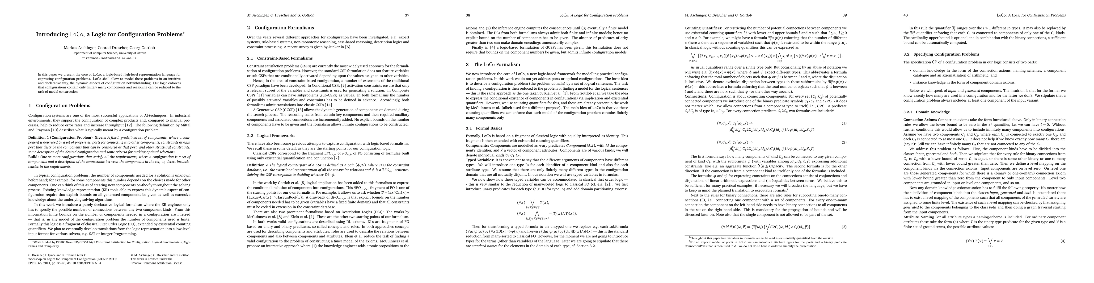LoCo is a new logic-based language for intuitively and declaratively modeling configuration problems, ensuring finite component constraints and enabling model construction for reasoning.