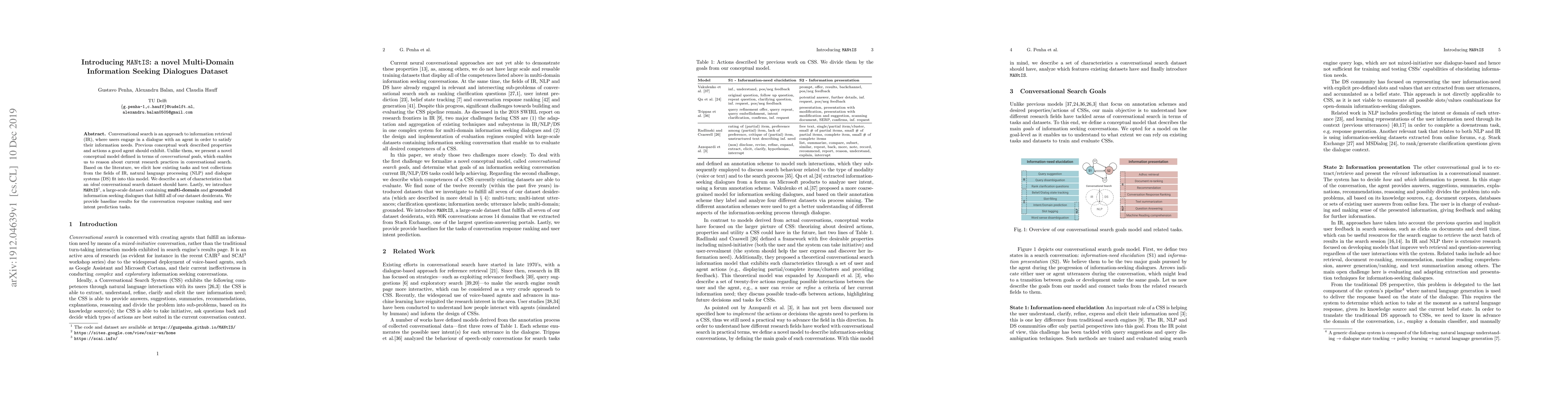This paper introduces MANtIS, a new multi-domain information seeking dialogues dataset, designed to fulfill criteria for ideal conversational search datasets. It provides baseline results for response ranking and intent prediction, aiming to advance research in conversational search.