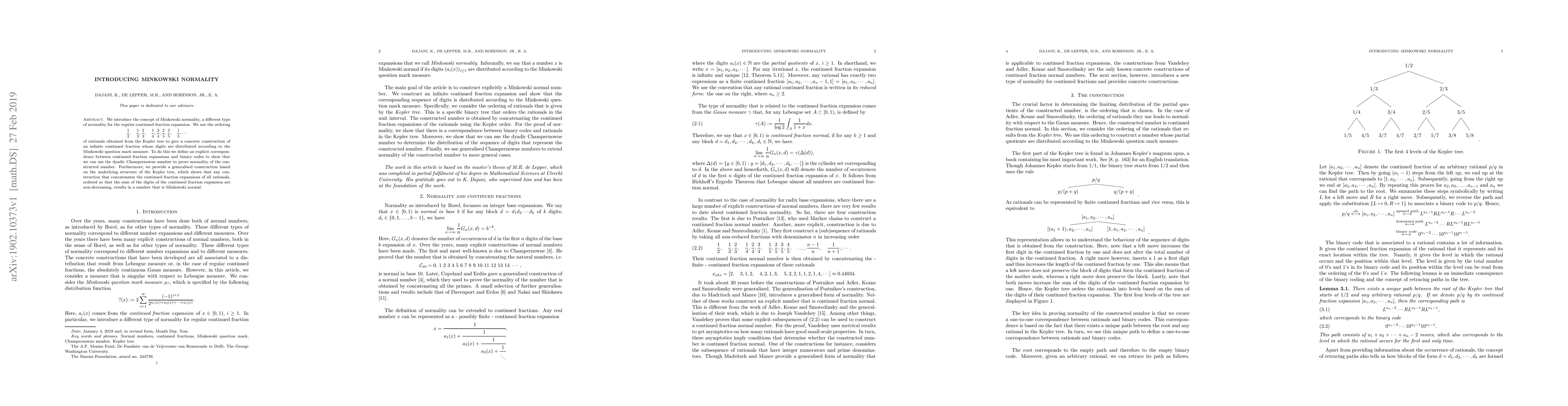 This paper introduces Minkowski normality for regular continued fraction expansions using a specific ordering from the Kepler tree. It constructs an infinite continued fraction with digits following the Minkowski question mark measure and proves its normality via the dyadic Champernowne number, demonstrating a generalised construction based on the Kepler tree's structure.