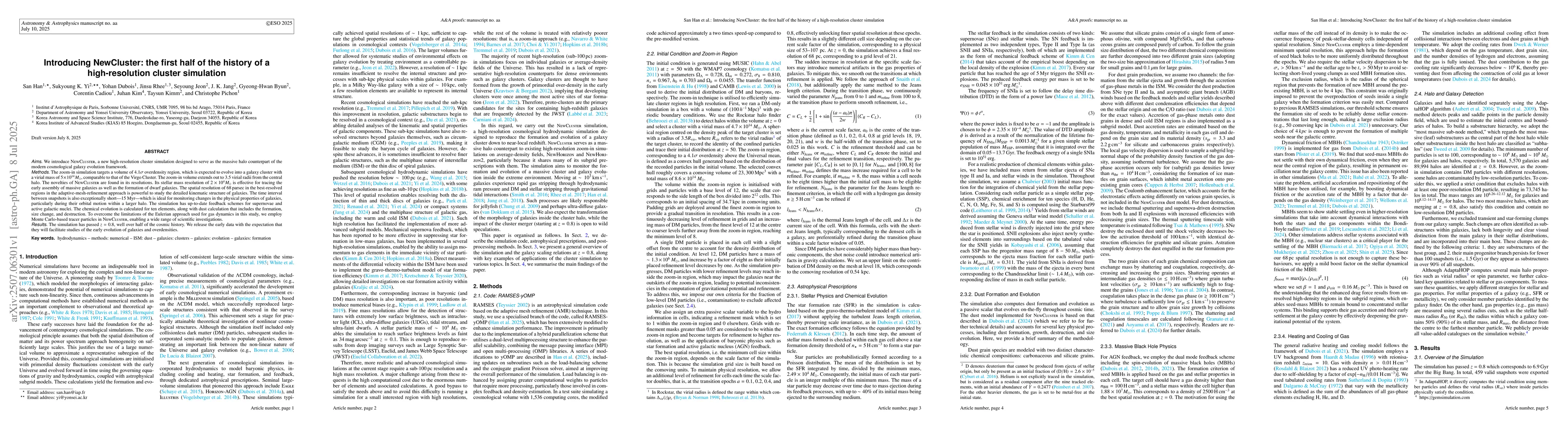 We introduce NewCluster, a new high-resolution cluster simulation designed to serve as the massive halo counterpart of the modern cosmological galaxy evolution framework. The zoom-in simulation targets a volume of $4.1\sigma$ overdensity region, which is expected to evolve into a galaxy cluster with a virial mass of $5 \times 10^{14} M_\odot$, comparable to that of the Virgo Cluster. The zoom-in volume extends out to 3.5 virial radii from the central halo. The novelties of NewCluster are found in its resolutions. Its stellar mass resolution of $2 \times 10^{4} M_\odot$ is effective for tracing the early assembly of massive galaxies as well as the formation of dwarf galaxies. The spatial resolution of 68 parsecs in the best-resolved regions in the adaptive-mesh-refinement approach is powerful to study the detailed kinematic structure of galaxies. The time interval between snapshots is also exceptionally short-15 Myr-which is ideal for monitoring changes in the physical properties of galaxies, particularly during their orbital motion within a larger halo. The simulation has up-to-date feedback schemes for supernovae and active galactic nuclei. The chemical evolution is calculated for ten elements, along with dust calculation that includes the formation, size change, and destruction. To overcome the limitations of the Eulerian approach used for gas dynamics in this study, we employ Monte Carlo-based tracer particles in NewCluster, enabling a wide range of scientific investigations.