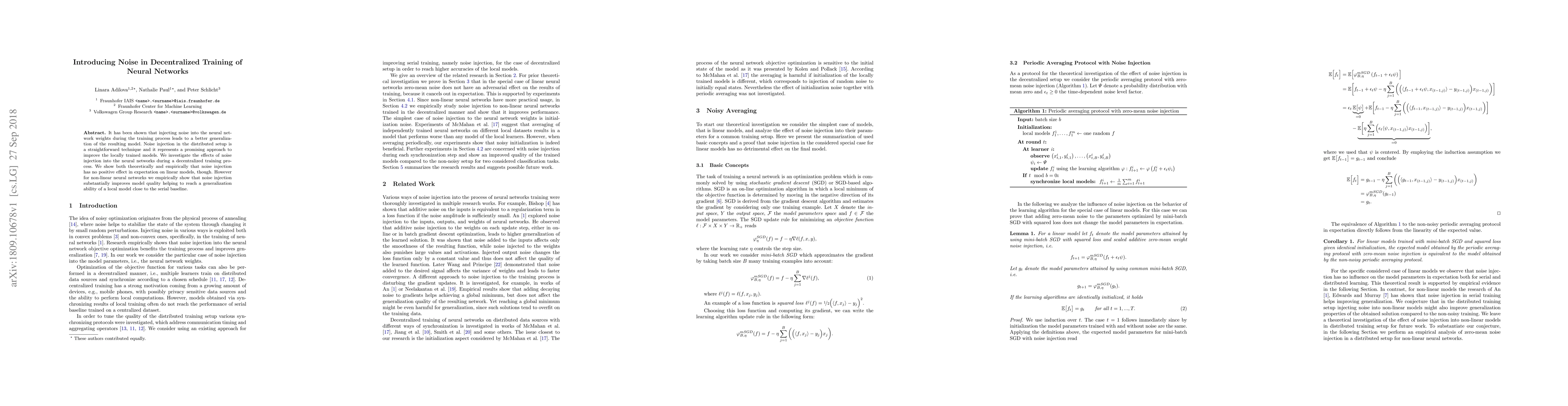 It has been shown that injecting noise into the neural network weights during the training process leads to a better generalization of the resulting model. Noise injection in the distributed setup is a straightforward technique and it represents a promising approach to improve the locally trained models. We investigate the effects of noise injection into the neural networks during a decentralized training process. We show both theoretically and empirically that noise injection has no positive effect in expectation on linear models, though. However for non-linear neural networks we empirically show that noise injection substantially improves model quality helping to reach a generalization ability of a local model close to the serial baseline.