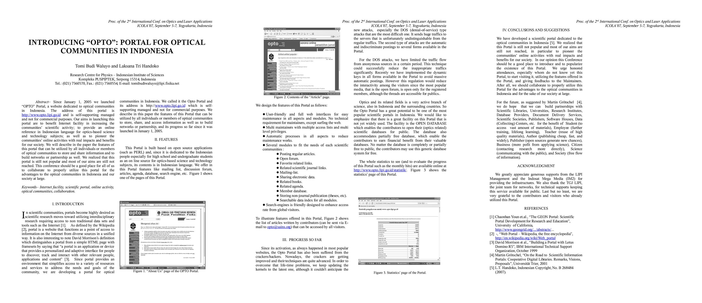 Since January 1, 2005 we have launched "OPTO" Portal, a website dedicated to optical communities in Indonesia. The address of this portal is http://www.opto.lipi.go.id and is self-supporting managed and not for commercial purposes. Our aims in launching this portal are to benefit Internet facility in increasing the communities' scientific activity; to provide an online reference in Indonesian language for optics-based science and technology subjects; as well as to pioneer the communities' online activities with real impacts and benefits for our society. We will describe in the paper the features of this portal that can be utilized by all individuals or members of optical communities to store and share information and to build networks or partnership as well. We realized that this portal is still not popular and most of our aims are still not reached. This conference should be a good place for all of us to collaborate to properly utilize this portal for the advantages to the optical communities in Indonesia and our society at large.