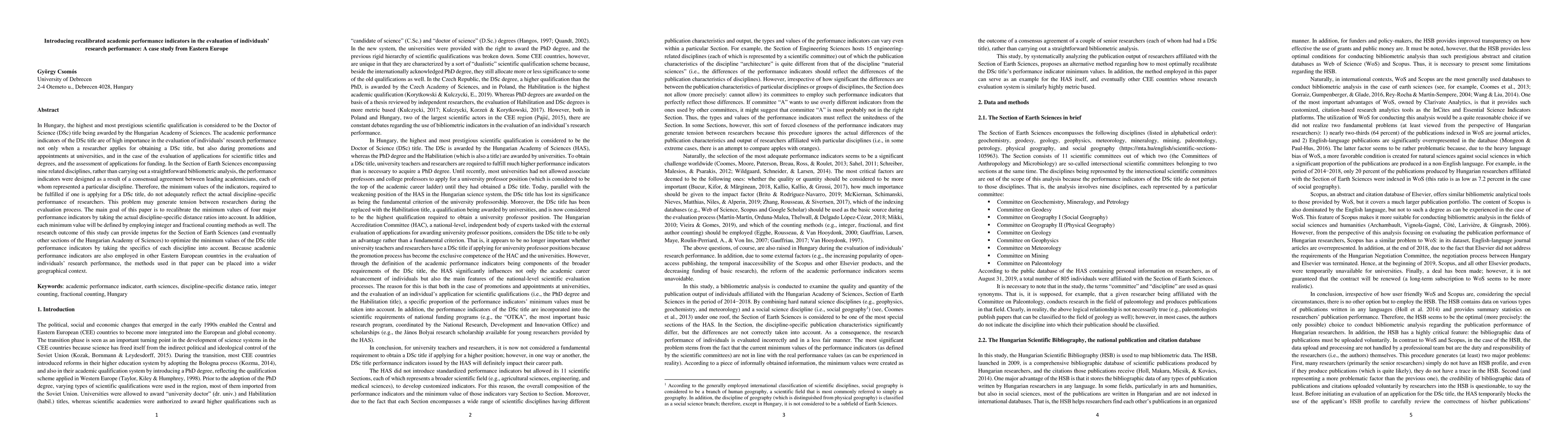 In Hungary, the highest and most prestigious scientific qualification is considered to be the Doctor of Science (DSc) title being awarded by the Hungarian Academy of Sciences. The academic performance indicators of the DSc title are of high importance in the evaluation of individuals' research performance not only when a researcher applies for obtaining a DSc title, but also during promotions and appointments at universities, and in the case of the evaluation of applications for scientific titles and degrees, and the assessment of applications for funding. In the Section of Earth Sciences encompassing nine related disciplines, rather than carrying out a straightforward bibliometric analysis, the performance indicators were designed as a result of a consensual agreement between leading academicians, each of whom represented a particular discipline. Therefore, the minimum values of the indicators, required to be fulfilled if one is applying for a DSc title, do not adequately reflect the actual discipline-specific performance of researchers. This problem may generate tension between researchers during the evaluation process. The main goal of this paper is to recalibrate the minimum values of four major performance indicators by taking the actual discipline-specific distance ratios into account. In addition, each minimum value will be defined by employing integer and fractional counting methods as well. The research outcome of this study can provide impetus for the Section of Earth Sciences to optimize the minimum values of the DSc title performance indicators by taking the specifics of each discipline into account. Because academic performance indicators are also employed in other Eastern European countries in the evaluation of individuals' research performance, the methods used in that paper can be placed into a wider geographical context.