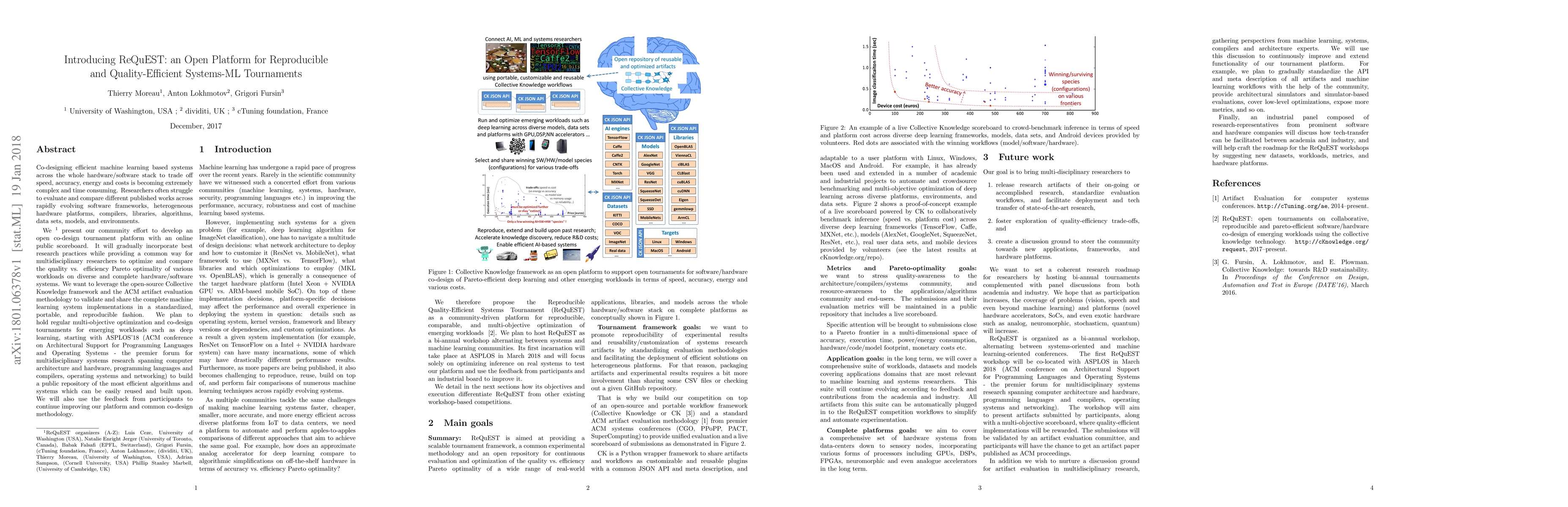 Co-designing efficient machine learning based systems across the whole hardware/software stack to trade off speed, accuracy, energy and costs is becoming extremely complex and time consuming. Researchers often struggle to evaluate and compare different published works across rapidly evolving software frameworks, heterogeneous hardware platforms, compilers, libraries, algorithms, data sets, models, and environments. We present our community effort to develop an open co-design tournament platform with an online public scoreboard. It will gradually incorporate best research practices while providing a common way for multidisciplinary researchers to optimize and compare the quality vs. efficiency Pareto optimality of various workloads on diverse and complete hardware/software systems. We want to leverage the open-source Collective Knowledge framework and the ACM artifact evaluation methodology to validate and share the complete machine learning system implementations in a standardized, portable, and reproducible fashion. We plan to hold regular multi-objective optimization and co-design tournaments for emerging workloads such as deep learning, starting with ASPLOS'18 (ACM conference on Architectural Support for Programming Languages and Operating Systems - the premier forum for multidisciplinary systems research spanning computer architecture and hardware, programming languages and compilers, operating systems and networking) to build a public repository of the most efficient machine learning algorithms and systems which can be easily customized, reused and built upon.