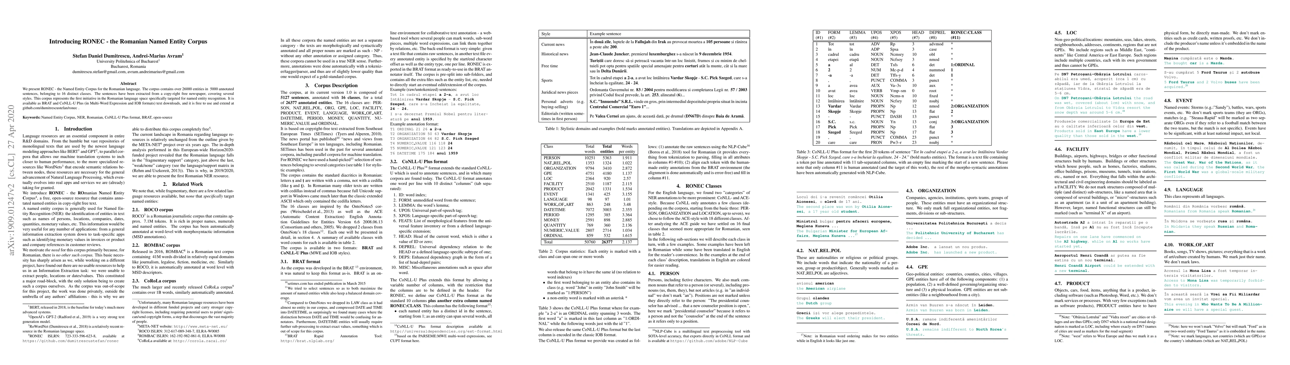 RONEC is a Romanian Named Entity Corpus containing over 26,000 entities in 5,000 annotated sentences, categorized into 16 classes, aimed at named entity recognition. It is freely available and extendable on GitHub.