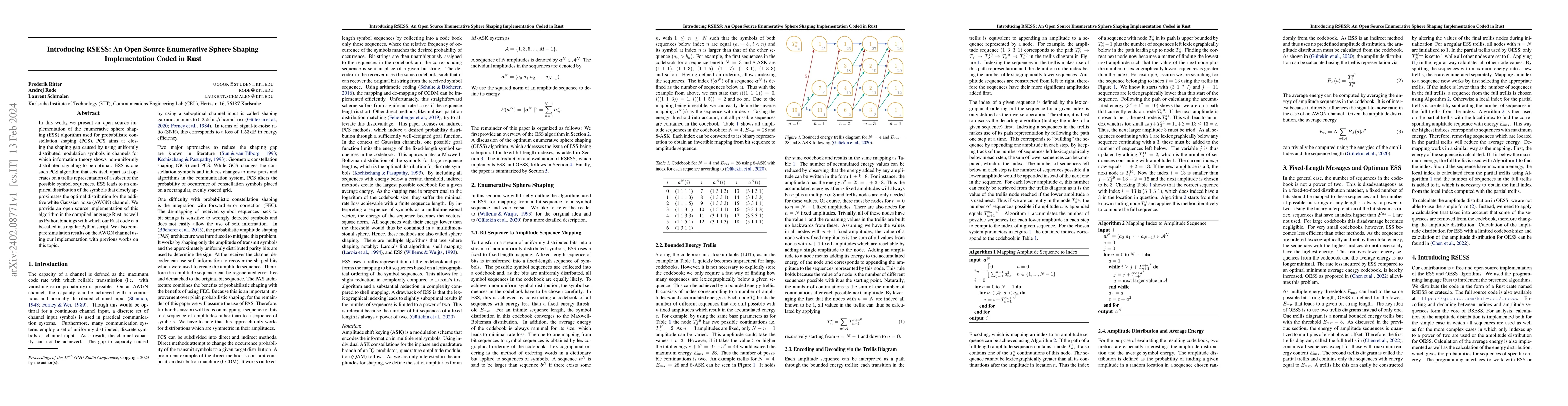This paper introduces RSESS, an open-source Rust implementation of the enumerative sphere shaping (ESS) algorithm for probabilistic constellation shaping (PCS). The ESS algorithm aims to close the shaping gap in channels by optimizing symbol distribution, leading to a distribution close to the optimal for the AWGN channel.