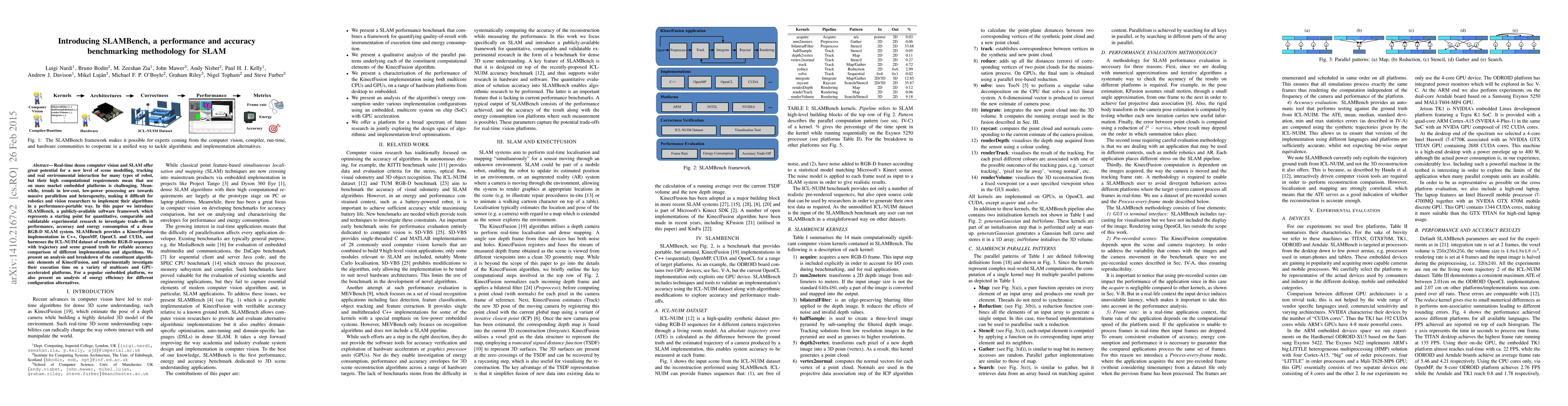 Real-time dense computer vision and SLAM offer great potential for a new level of scene modelling, tracking and real environmental interaction for many types of robot, but their high computational requirements mean that use on mass market embedded platforms is challenging. Meanwhile, trends in low-cost, low-power processing are towards massive parallelism and heterogeneity, making it difficult for robotics and vision researchers to implement their algorithms in a performance-portable way. In this paper we introduce SLAMBench, a publicly-available software framework which represents a starting point for quantitative, comparable and validatable experimental research to investigate trade-offs in performance, accuracy and energy consumption of a dense RGB-D SLAM system. SLAMBench provides a KinectFusion implementation in C++, OpenMP, OpenCL and CUDA, and harnesses the ICL-NUIM dataset of synthetic RGB-D sequences with trajectory and scene ground truth for reliable accuracy comparison of different implementation and algorithms. We present an analysis and breakdown of the constituent algorithmic elements of KinectFusion, and experimentally investigate their execution time on a variety of multicore and GPUaccelerated platforms. For a popular embedded platform, we also present an analysis of energy efficiency for different configuration alternatives.