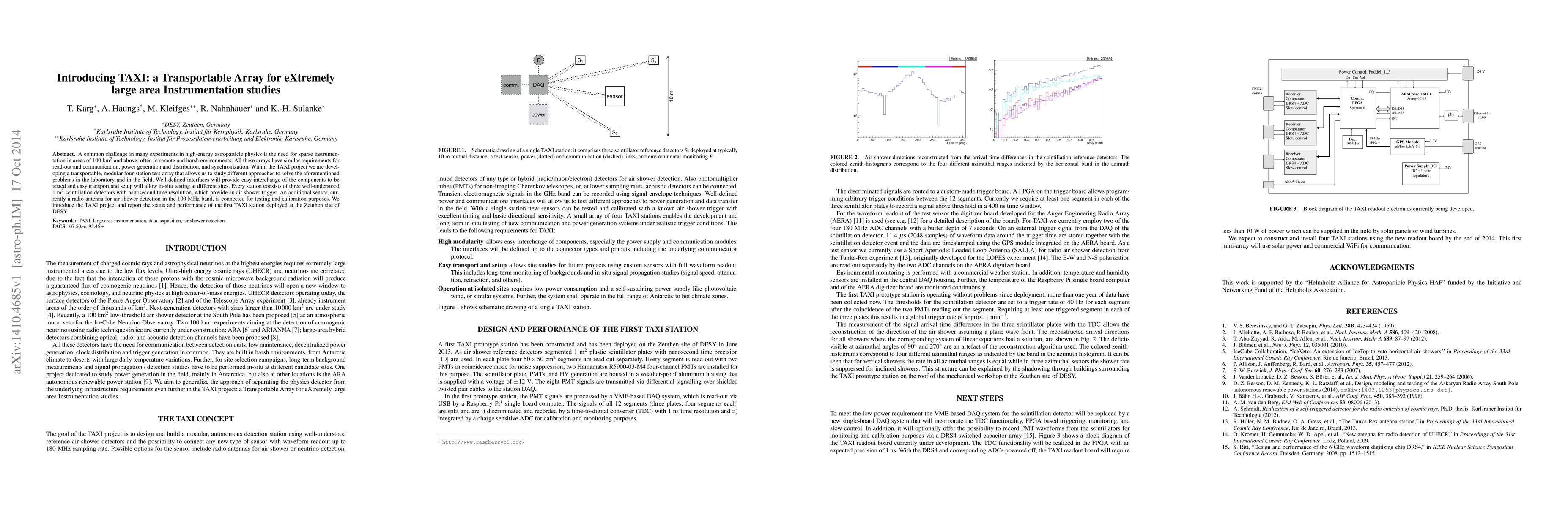 A common challenge in many experiments in high-energy astroparticle physics is the need for sparse instrumentation in areas of 100 km2 and above, often in remote and harsh environments. All these arrays have similar requirements for read-out and communication, power generation and distribution, and synchronization. Within the TAXI project we are developing a transportable, modular four-station test-array that allows us to study different approaches to solve the aforementioned problems in the laboratory and in the field. Well-defined interfaces will provide easy interchange of the components to be tested and easy transport and setup will allow in-situ testing at different sites. Every station consists of three well-understood 1 m2 scintillation detectors with nanosecond time resolution, which provide an air shower trigger. An additional sensor, currently a radio antenna for air shower detection in the 100 MHz band, is connected for testing and calibration purposes. We introduce the TAXI project and report the status and performance of the first TAXI station deployed at the Zeuthen site of DESY.