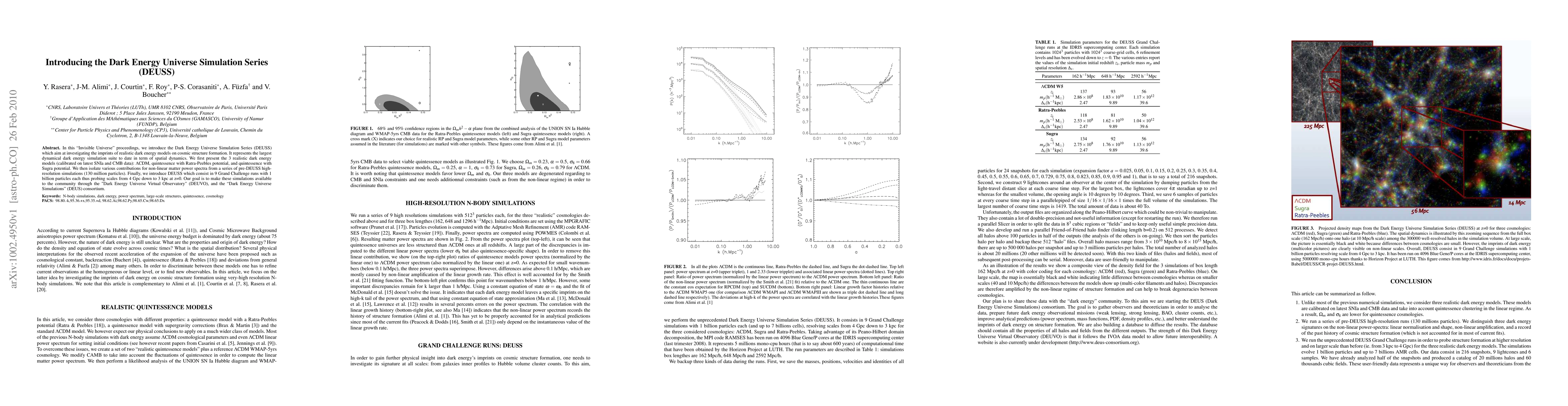 In this "Invisible Universe" proceedings, we introduce the Dark Energy Universe Simulation Series (DEUSS) which aim at investigating the imprints of realistic dark energy models on cosmic structure formation. It represents the largest dynamical dark energy simulation suite to date in term of spatial dynamics. We first present the 3 realistic dark energy models (calibrated on latest SNIa and CMB data): LambdaCDM, quintessence with Ratra-Peebles potential, and quintessence with Sugra potential. We then isolate various contributions for non-linear matter power spectra from a series of pre-DEUSS high-resolution simulations (130 million particles). Finally, we introduce DEUSS which consist in 9 Grand Challenge runs with 1 billion particles each thus probing scales from 4 Gpc down to 3 kpc at z=0. Our goal is to make these simulations available to the community through the "Dark Energy Universe Virtual Observatory" (DEUVO), and the "Dark Energy Universe Simulations" (DEUS) consortium.