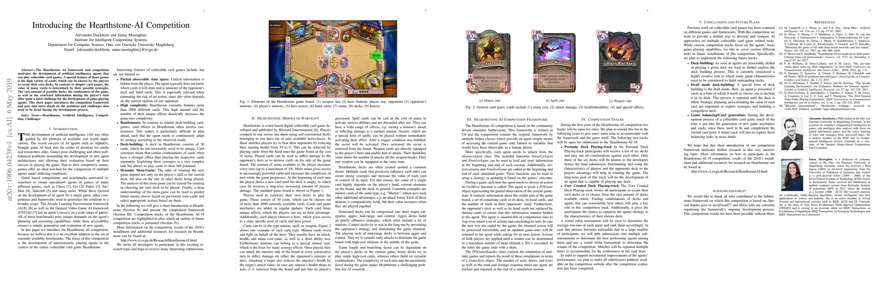 The Hearthstone AI framework and competition motivates the development of artificial intelligence agents that can play collectible card games. A special feature of those games is the high variety of cards, which can be chosen by the players to create their own decks. In contrast to simpler card games, the value of many cards is determined by their possible synergies. The vast amount of possible decks, the randomness of the game, as well as the restricted information during the player's turn offer quite a hard challenge for the development of game-playing agents. This short paper introduces the competition framework and goes into more detail on the problems and challenges that need to be faced during the development process.