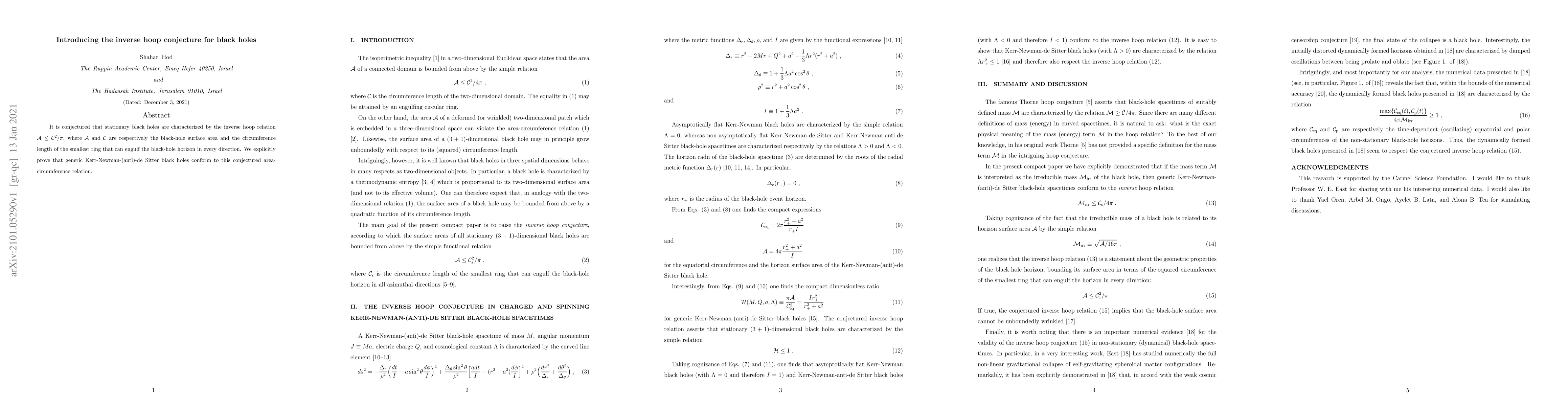 It is conjectured that stationary black holes are characterized by the inverse hoop relation ${\cal A}\leq {\cal C}^2/\pi$, where ${\cal A}$ and ${\cal C}$ are respectively the black-hole surface area and the circumference length of the smallest ring that can engulf the black-hole horizon in every direction. We explicitly prove that generic Kerr-Newman-(anti)-de Sitter black holes conform to this conjectured area-circumference relation.