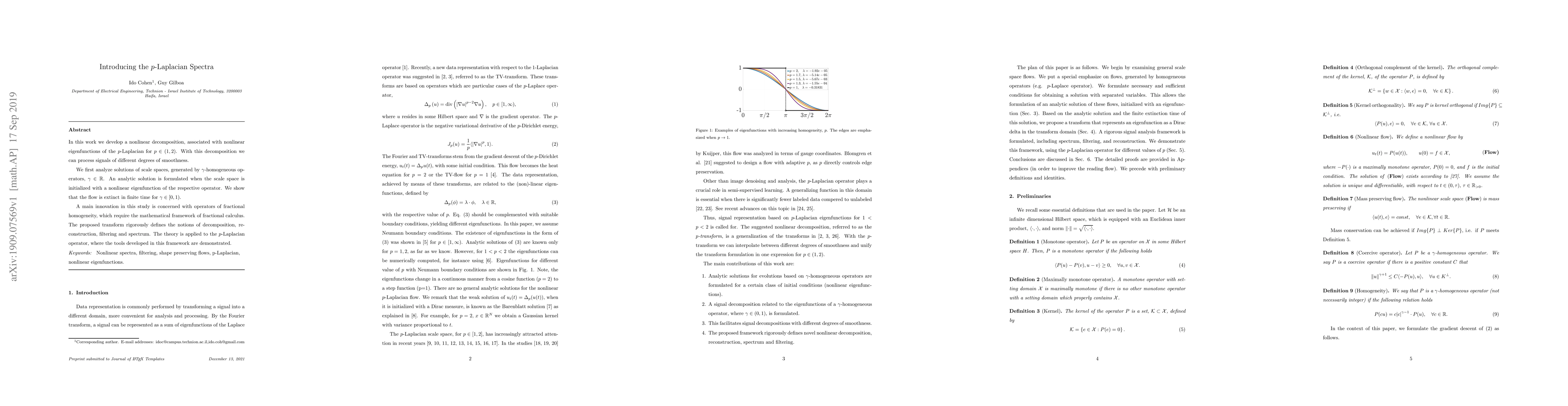 In this work we develop a nonlinear decomposition, associated with nonlinear eigenfunctions of the p-Laplacian for p \in (1, 2). With this decomposition we can process signals of different degrees of smoothness. We first analyze solutions of scale spaces, generated by {\gamma}-homogeneous operators, {\gamma} \in R. An analytic solution is formulated when the scale space is initialized with a nonlinear eigenfunction of the respective operator. We show that the flow is extinct in finite time for {\gamma} \in [0, 1). A main innovation in this study is concerned with operators of fractional homogeneity, which require the mathematical framework of fractional calculus. The proposed transform rigorously defines the notions of decomposition, reconstruction, filtering and spectrum. The theory is applied to the p-Laplacian operator, where the tools developed in this framework are demonstrated. Keywords: Nonlinear spectra, filtering, shape preserving flows, p-Laplacian, nonlinear eigenfunctions.