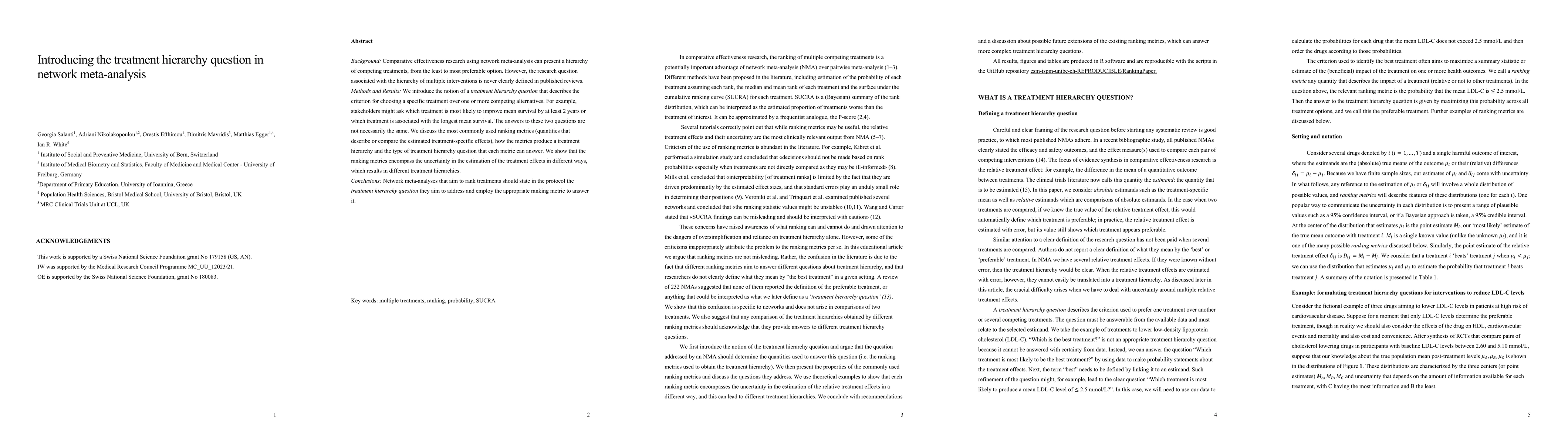 This paper introduces the concept of a treatment hierarchy question in network meta-analysis to clarify the criteria for selecting among competing treatments. It emphasizes the importance of specifying the hierarchy question in protocols and choosing appropriate ranking metrics to accurately address the intended treatment hierarchy.