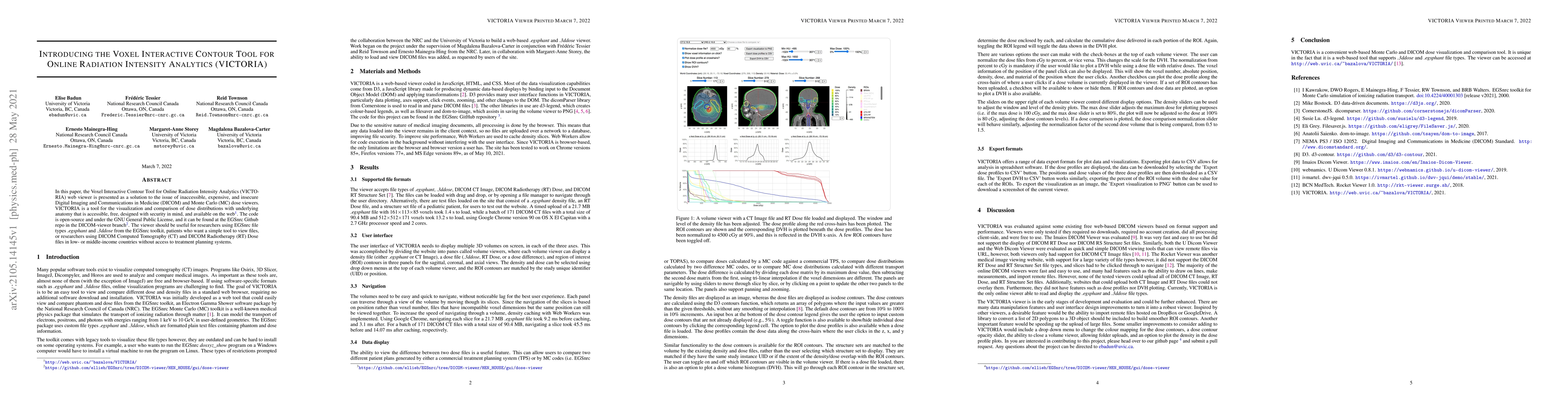 The paper introduces VICTORIA, a web-based tool for visualizing and comparing radiation dose distributions with anatomical data, offering a free, secure, and accessible alternative to expensive DICOM and Monte Carlo dose viewers. The tool is open-source and designed to benefit researchers and patients in low- or middle-income countries.