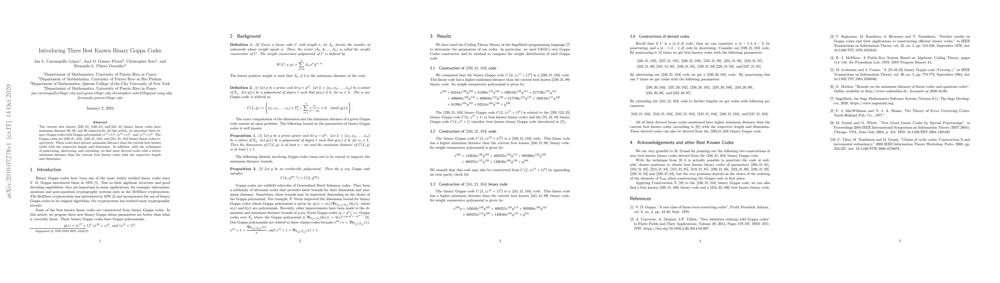 This paper introduces three new binary Goppa codes with improved minimum distance compared to the current best known codes. The codes are derived from specific Goppa polynomials and achieve lengths of 239, 240, and 241 with dimensions 21, surpassing previous records.