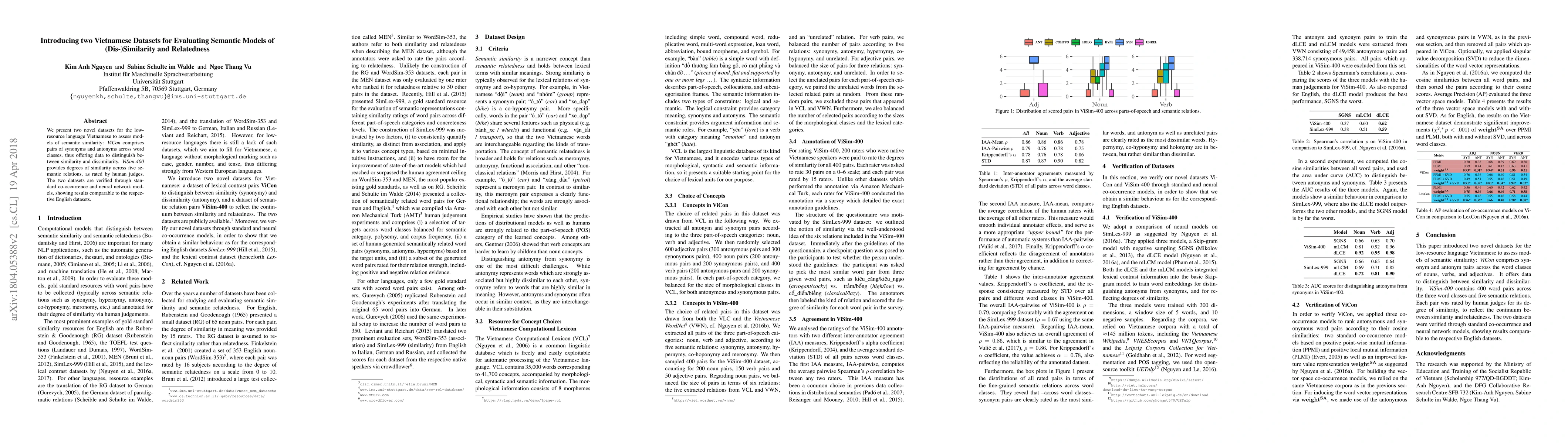 Two new datasets for Vietnamese language are introduced to evaluate semantic similarity models, including ViCon for synonym-antonym pairs and ViSim-400 with human-rated similarities across five relations.