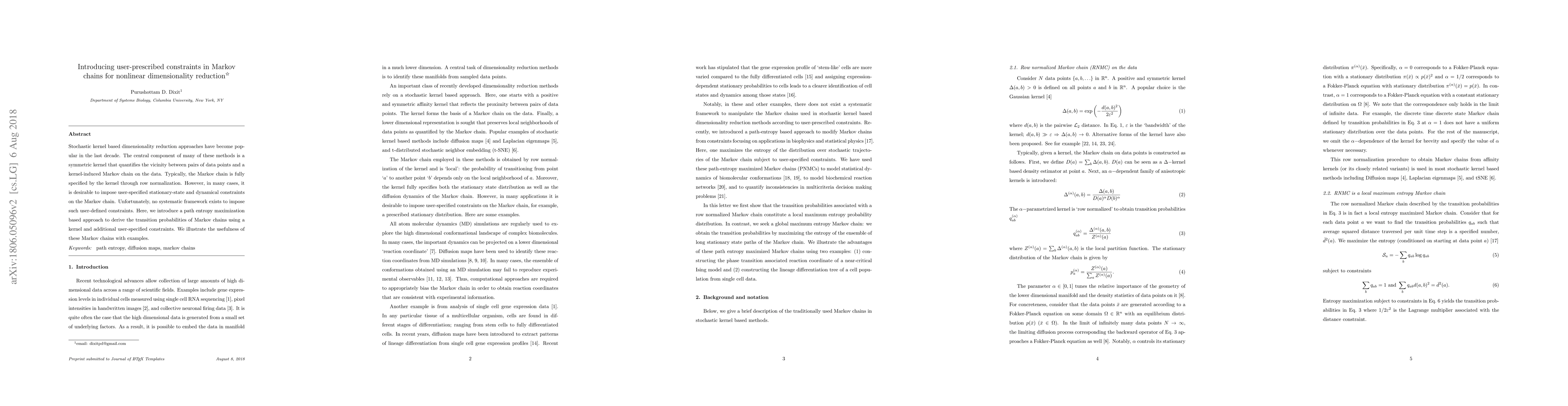This paper introduces a method for incorporating user-prescribed constraints into Markov chains for nonlinear dimensionality reduction. It proposes a path entropy maximization approach to derive transition probabilities that satisfy both kernel-based and user-defined stationary-state and dynamical constraints.