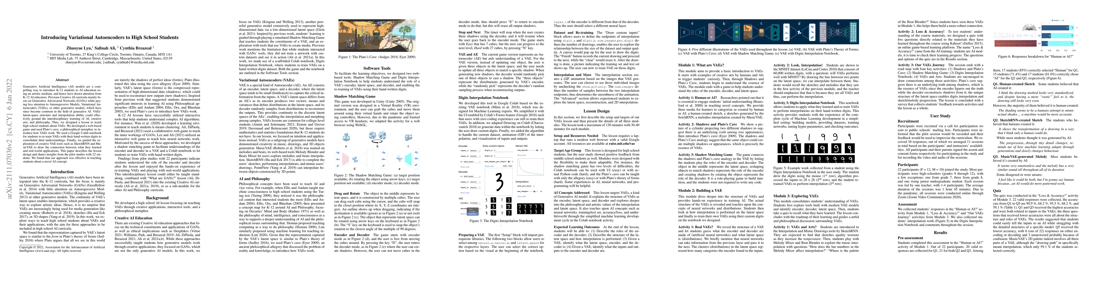 This paper introduces a lesson plan for high school students to learn about Variational Autoencoders (VAEs) using a web-based game and philosophical metaphors. The pilot study with 22 students showed that the approach effectively conveyed the novel AI concept.