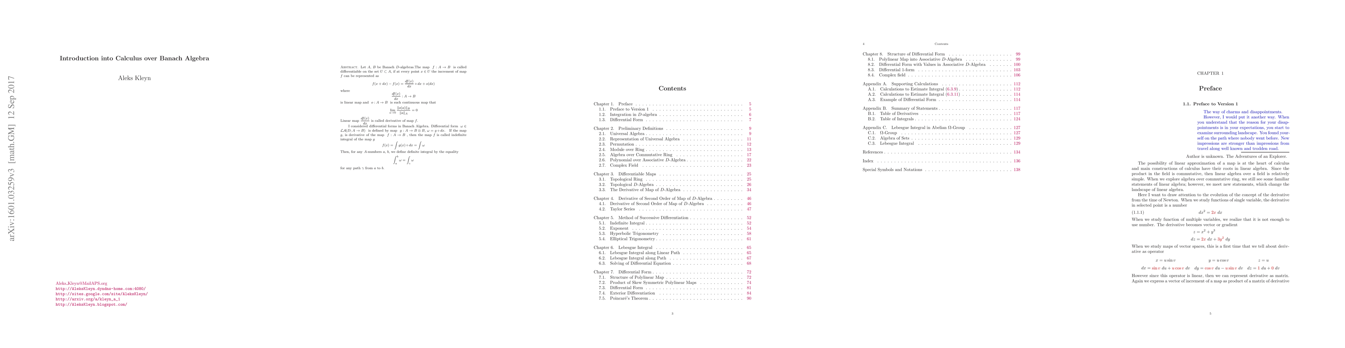 Let $A$, $B$ be Banach $D$-algebras. The map $f:A\rightarrow B$ is called differentiable on the set $U\subset A$, if at every point $x\in U$ the increment of map $f$ can be represented as $$f(x+dx)-f(x) =\frac{d f(x)}{d x}\circ dx +o(dx)$$ where $$\frac{d f(x)}{d x}:A\rightarrow B$$ is linear map and $o:A\rightarrow B$ is such continuous map that $$\lim_{a\rightarrow 0}\frac{\|o(a)\|_B}{\|a\|_A}=0$$ Linear map $\displaystyle\frac{d f(x)}{d x}$ is called derivative of map $f$. I considered differential forms in Banach Algebra. Differential form $\omega\in\mathcal{LA}(D;A\rightarrow B)$ is defined by map $g:A\rightarrow B\otimes B$, $\omega=g\circ dx$. If the map $g$, is derivative of the map $f:A\rightarrow B$, then the map $f$ is called indefinite integral of the map $g$ $$f(x)=\int g(x)\circ dx=\int\omega$$ Then, for any $A$-numbers $a$, $b$, we define definite integral by the equality $$\int_a^b\omega=\int_{\gamma}\omega$$ for any path $\gamma$ from $a$ to $b$.
