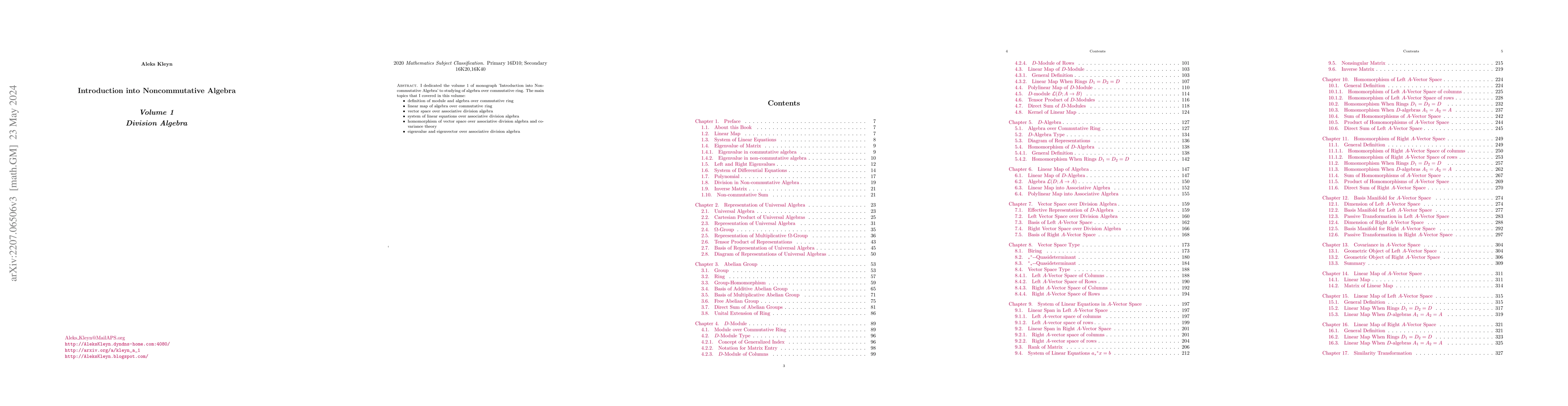 **Summary:** This volume introduces noncommutative algebra over commutative rings, focusing on modules, linear maps, vector spaces over division algebras, and the theory of linear equations, including homomorphisms, eigenvalues, and eigenvectors.