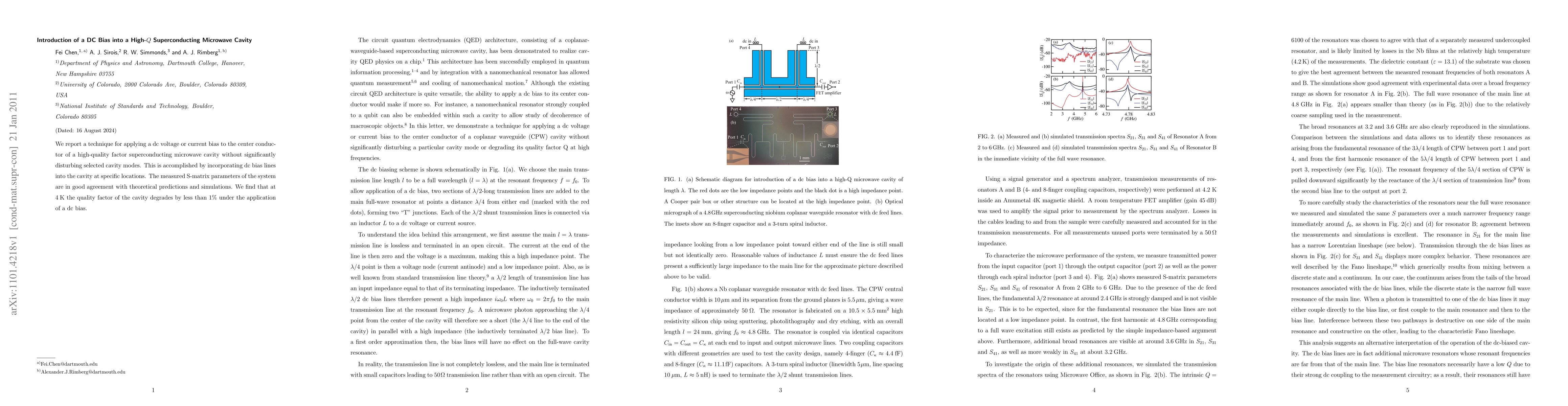 This paper introduces a method to apply a dc bias to a high-Q superconducting microwave cavity without significantly affecting its modes, achieved by incorporating bias lines at specific locations. The technique maintains cavity quality, degrading the quality factor by less than 1% at 4 K.