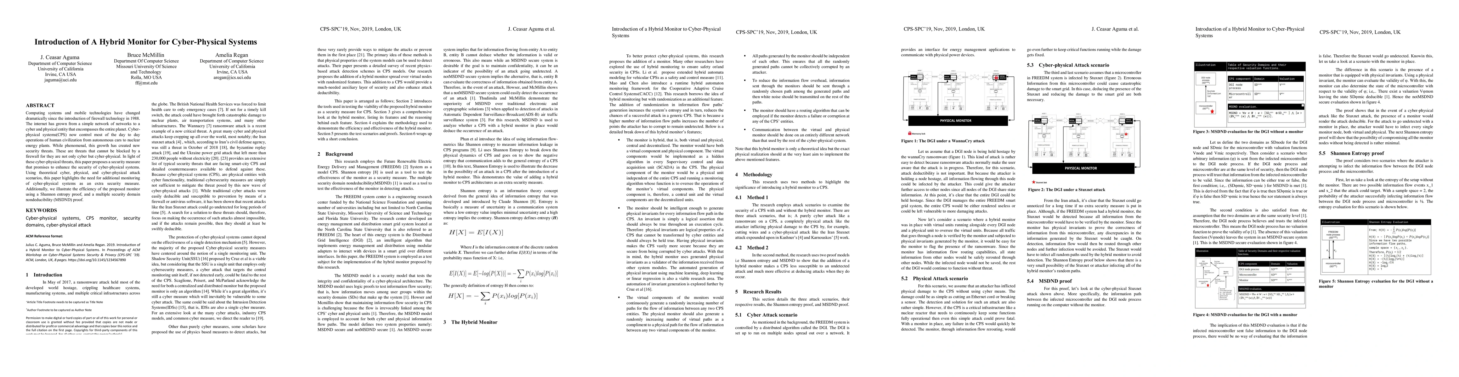 This paper proposes a hybrid monitor to enhance the security of cyber-physical systems, addressing new threats that traditional firewalls cannot block. It demonstrates the monitor's effectiveness through theoretical attack scenarios and proofs of entropy and nondeducibility.
