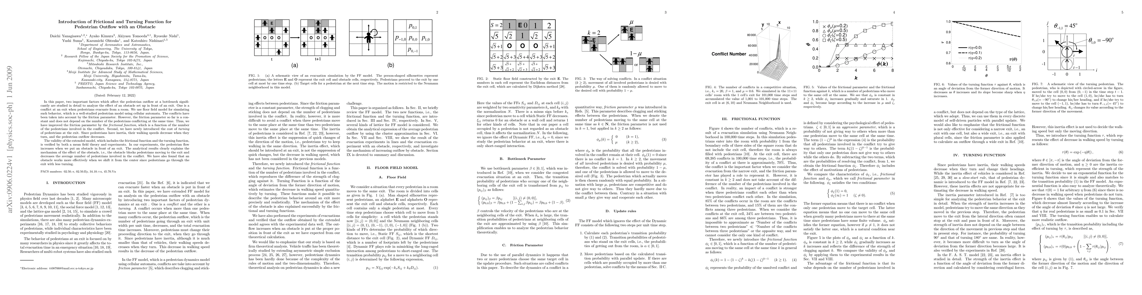 In this paper, two important factors which affect the pedestrian outflow at a bottleneck significantly are studied in detail to analyze the effect of an obstacle set up in front of an exit. One is a conflict at an exit when pedestrians evacuate from a room. We use floor field model for simulating such behavior, which is a well-studied pedestrian model using cellular automata. The conflicts have been taken into account by the friction parameter. However, the friction parameter so far is a constant and does not depend on the number of the pedestrians conflicting at the same time. Thus, we have improved the friction parameter by the frictional function, which is a function of the number of the pedestrians involved in the conflict. Second, we have newly introduced the cost of turning of pedestrians at the exit. Since pedestrians have inertia, their walking speeds decrease when they turn, and the pedestrian outflow decreases. The validity of the extended model, which includes the frictional function and the turning function, is verified by both a mean field theory and experiments. In our experiments, the pedestrian flow increases when we put an obstacle in front of an exit. The analytical results clearly explains the mechanism of the effect of the obstacle, i.e., the obstacle blocks pedestrians moving to the exit and decreases the average number of pedestrians involved in the conflict. We have also found that an obstacle works more effectively when we shift it from the center since pedestrians go through the exit with less turning.