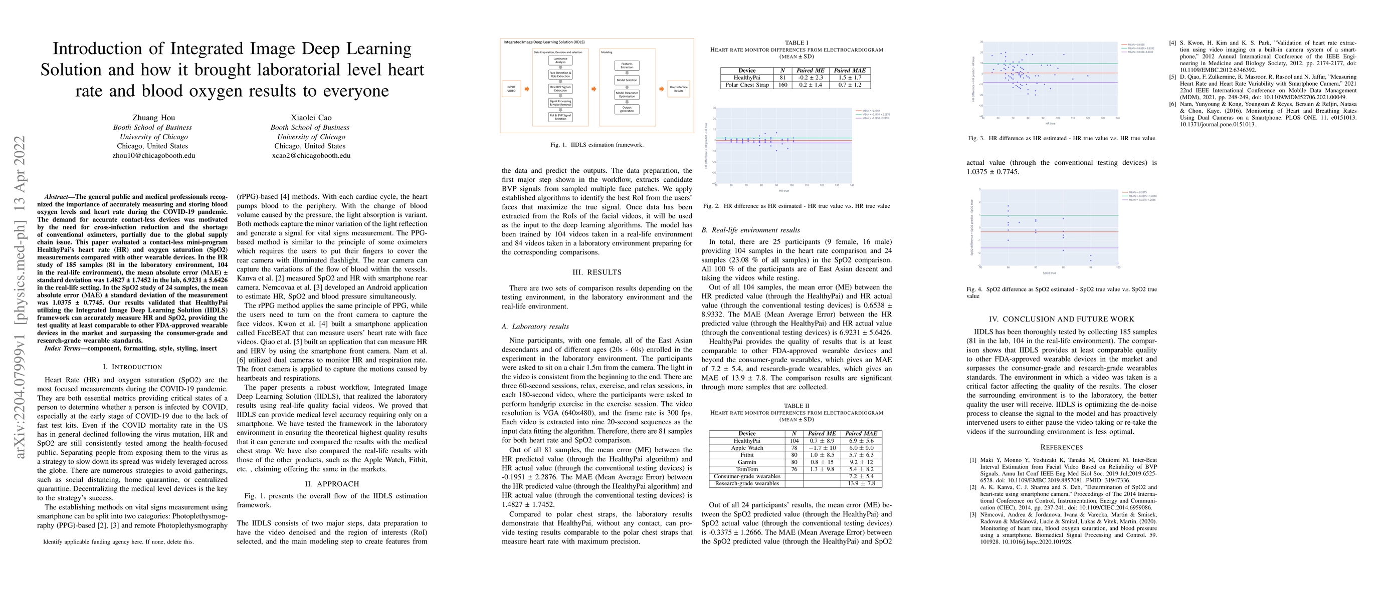 The general public and medical professionals recognized the importance of accurately measuring and storing blood oxygen levels and heart rate during the COVID-19 pandemic. The demand for accurate contact-less devices was motivated by the need for cross-infection reduction and the shortage of conventional oximeters, partially due to the global supply chain issue. This paper evaluated a contact-less mini-program HealthyPai's heart rate (HR) and oxygen saturation (SpO2) measurements compared with other wearable devices. In the HR study of 185 samples (81 in the laboratory environment, 104 in the real-life environment), the mean absolute error (MAE) $\pm$ standard deviation was $1.4827 \pm 1.7452$ in the lab, $6.9231 \pm 5.6426$ in the real-life setting. In the SpO2 study of 24 samples, the mean absolute error (MAE) $\pm$ standard deviation of the measurement was $1.0375 \pm 0.7745$. Our results validated that HealthyPai utilizing the Integrated Image Deep Learning Solution (IIDLS) framework can accurately measure HR and SpO2, providing the test quality at least comparable to other FDA-approved wearable devices in the market and surpassing the consumer-grade and research-grade wearable standards.