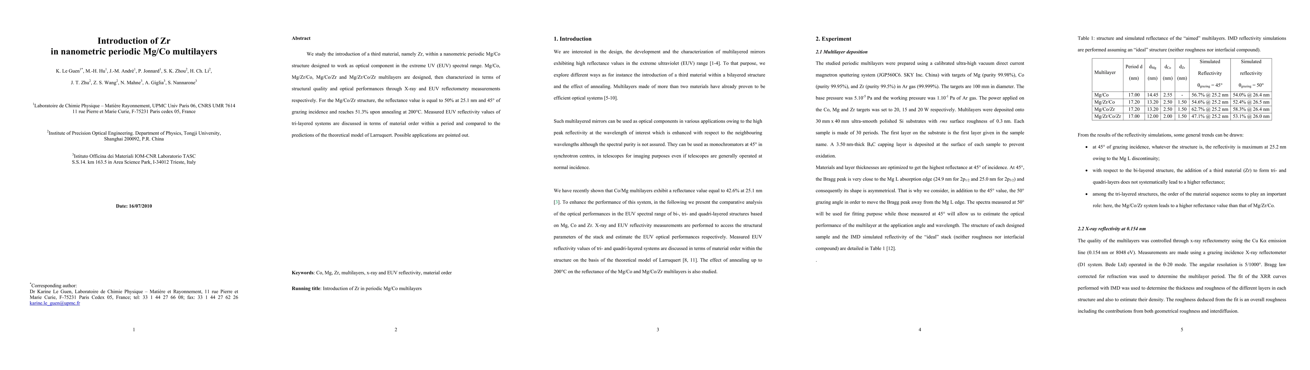This research investigates the incorporation of Zr in nanometric periodic Mg/Co multilayers for extreme UV (EUV) optical components. The structural and optical qualities of Mg/Co, Mg/Zr/Co, Mg/Co/Zr, and Mg/Zr/Co/Zr multilayers were analyzed, revealing that Mg/Co/Zr achieves 50% reflectance at 25.1 nm and improves to 51.3% upon annealing, with implications for EUV reflectivity and potential applications.