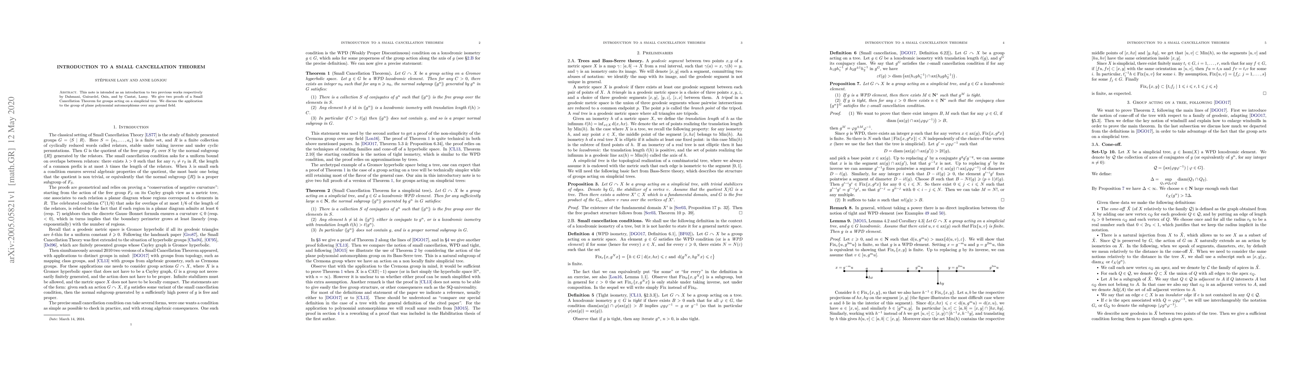 This note is intended as an introduction to two previous works respectively by Dahmani, Guirardel, Osin, and by Cantat, Lamy. We give two proofs of a Small Cancellation Theorem for groups acting on a simplicial tree. We discuss the application to the group of plane polynomial automorphisms over any ground field.