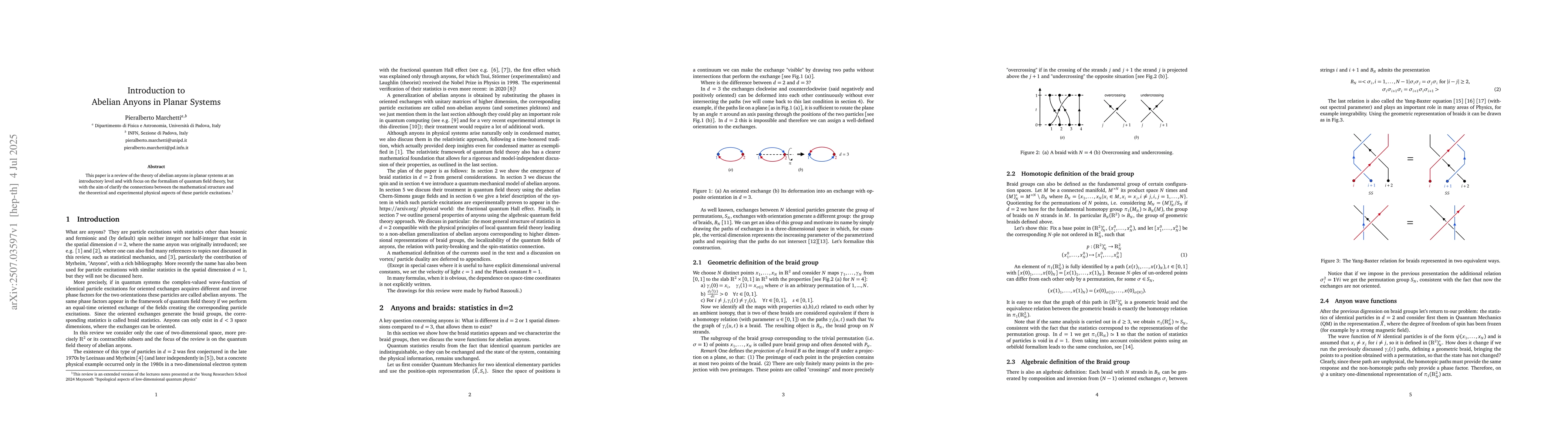 This paper is a review of the theory of abelian anyons in planar systems at an introductory level and with focus on the formalism of quantum field theory, but with the aim of clarify the connections between the mathematical structure and the theoretical and experimental physical aspects of these particle excitations.