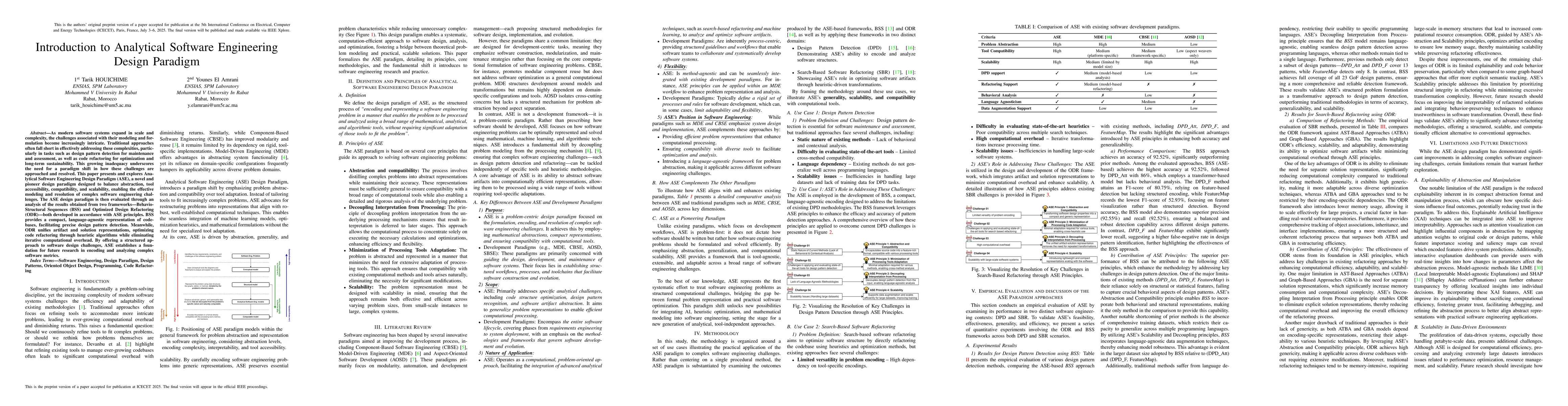 A new design paradigm called Analytical Software Engineering (ASE) is introduced to address complex software engineering challenges, offering a structured approach to modeling and resolving intricate problems. ASE balances abstraction, tool accessibility, compatibility, and scalability, providing frameworks for precise design pattern detection and optimized code refactoring.