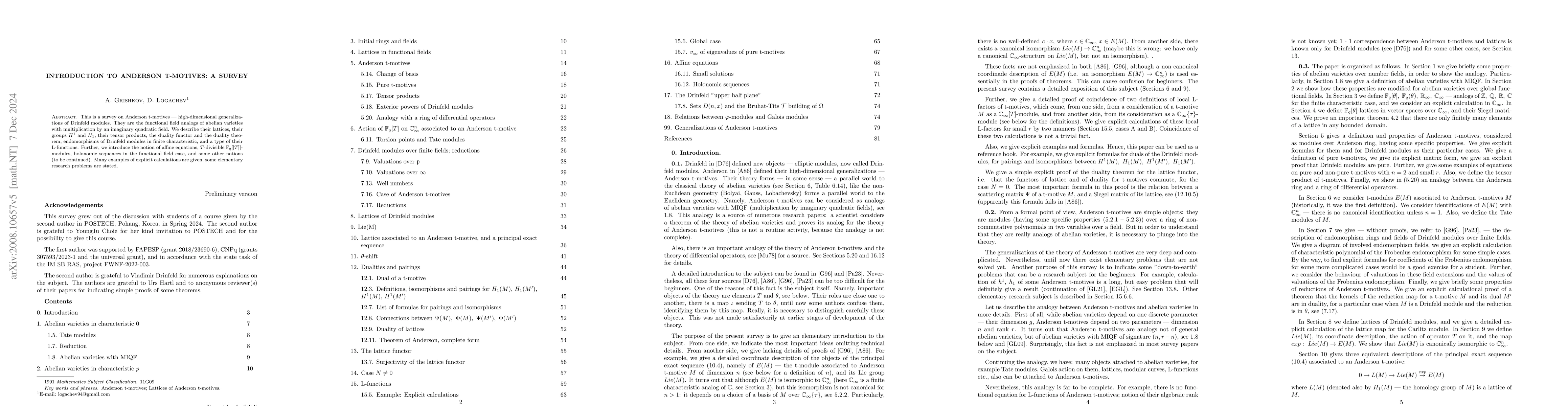 This survey introduces Anderson t-motives, high-dimensional generalizations of Drinfeld modules, detailing their structures, lattices, and duality theorems, alongside examples and research problems. It also covers affine equations, $T$-divisible modules, and holonomic sequences.