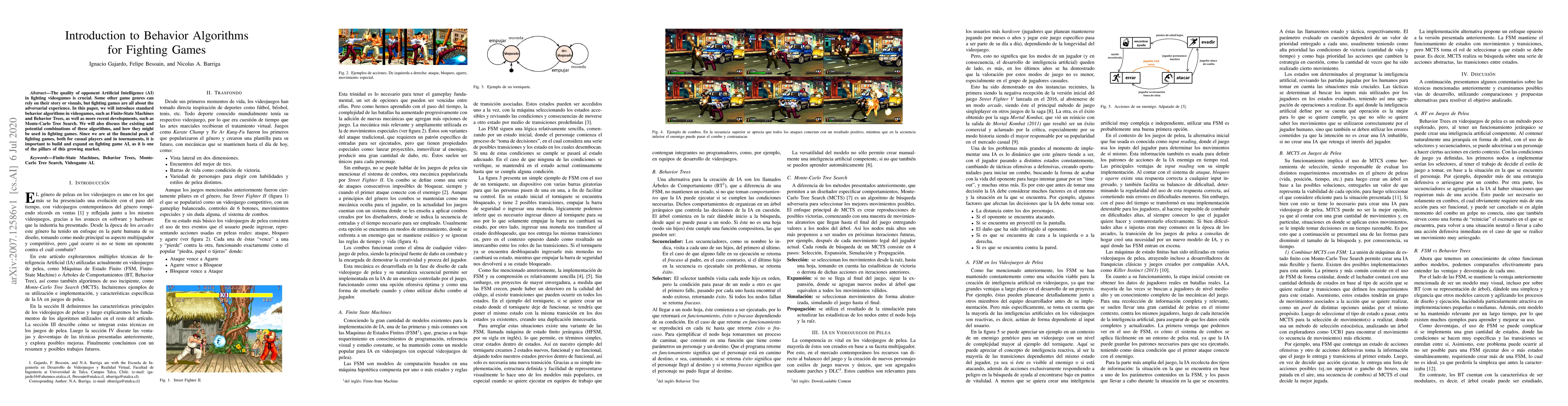 The quality of opponent Artificial Intelligence (AI) in fighting videogames is crucial. Some other game genres can rely on their story or visuals, but fighting games are all about the adversarial experience. In this paper, we will introduce standard behavior algorithms in videogames, such as Finite-State Machines and Behavior Trees, as well as more recent developments, such as Monte-Carlo Tree Search. We will also discuss the existing and potential combinations of these algorithms, and how they might be used in fighting games. Since we are at the financial peak of fighting games, both for casual players and in tournaments, it is important to build and expand on fighting game AI, as it is one of the pillars of this growing market.