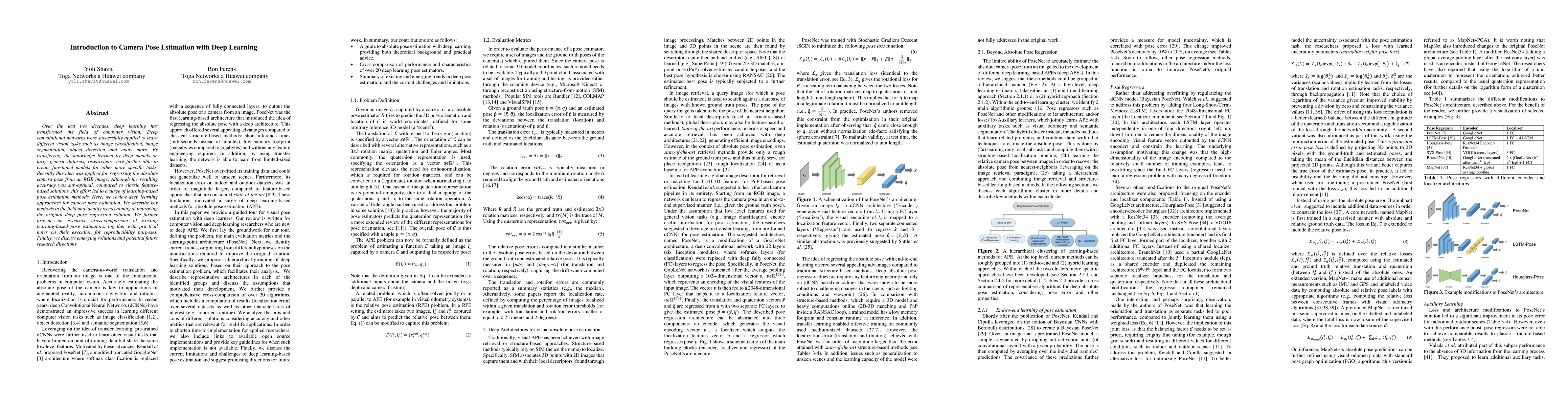 Over the last two decades, deep learning has transformed the field of computer vision. Deep convolutional networks were successfully applied to learn different vision tasks such as image classification, image segmentation, object detection and many more. By transferring the knowledge learned by deep models on large generic datasets, researchers were further able to create fine-tuned models for other more specific tasks. Recently this idea was applied for regressing the absolute camera pose from an RGB image. Although the resulting accuracy was sub-optimal, compared to classic feature-based solutions, this effort led to a surge of learning-based pose estimation methods. Here, we review deep learning approaches for camera pose estimation. We describe key methods in the field and identify trends aiming at improving the original deep pose regression solution. We further provide an extensive cross-comparison of existing learning-based pose estimators, together with practical notes on their execution for reproducibility purposes. Finally, we discuss emerging solutions and potential future research directions.