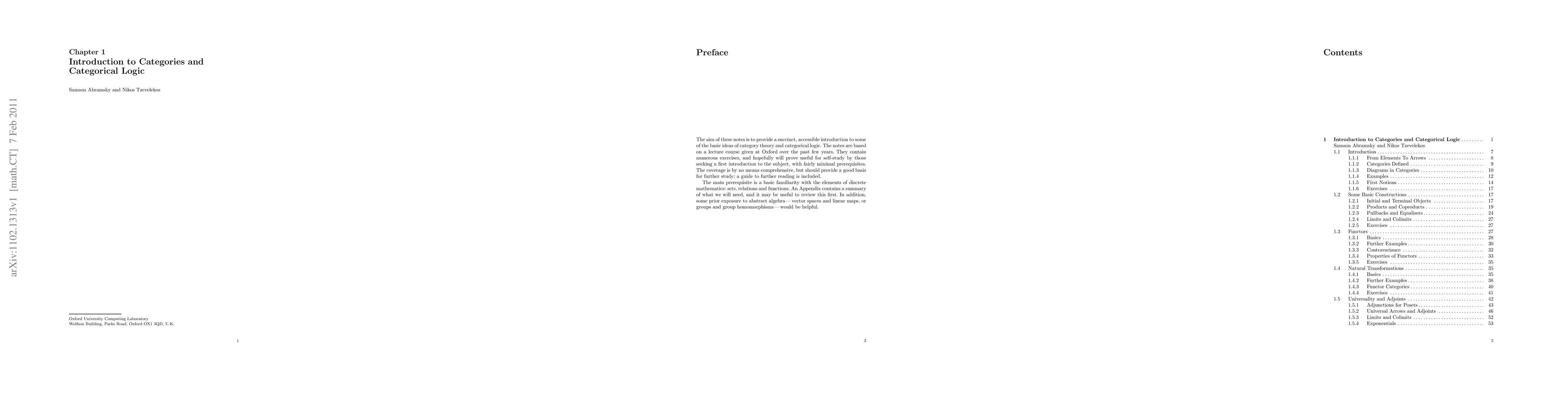 The aim of these notes is to provide a succinct, accessible introduction to some of the basic ideas of category theory and categorical logic. The notes are based on a lecture course given at Oxford over the past few years. They contain numerous exercises, and hopefully will prove useful for self-study by those seeking a first introduction to the subject, with fairly minimal prerequisites. The coverage is by no means comprehensive, but should provide a good basis for further study; a guide to further reading is included. The main prerequisite is a basic familiarity with the elements of discrete mathematics: sets, relations and functions. An Appendix contains a summary of what we will need, and it may be useful to review this first. In addition, some prior exposure to abstract algebra - vector spaces and linear maps, or groups and group homomorphisms - would be helpful.