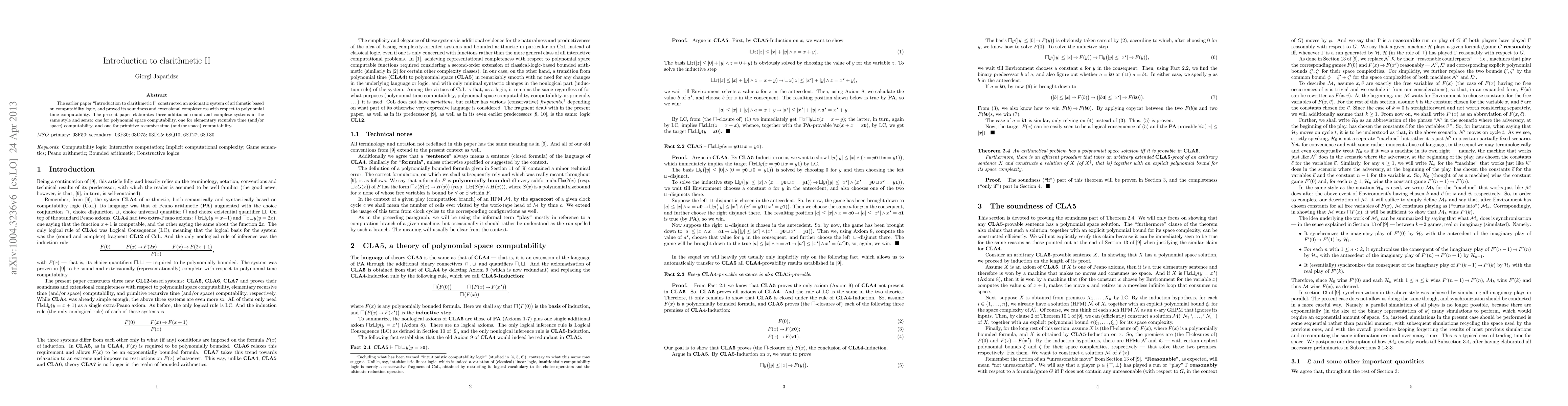 The earlier paper "Introduction to clarithmetic I" constructed an axiomatic system of arithmetic based on computability logic (see http://www.cis.upenn.edu/~giorgi/cl.html), and proved its soundness and extensional completeness with respect to polynomial time computability. The present paper elaborates three additional sound and complete systems in the same style and sense: one for polynomial space computability, one for elementary recursive time (and/or space) computability, and one for primitive recursive time (and/or space) computability.