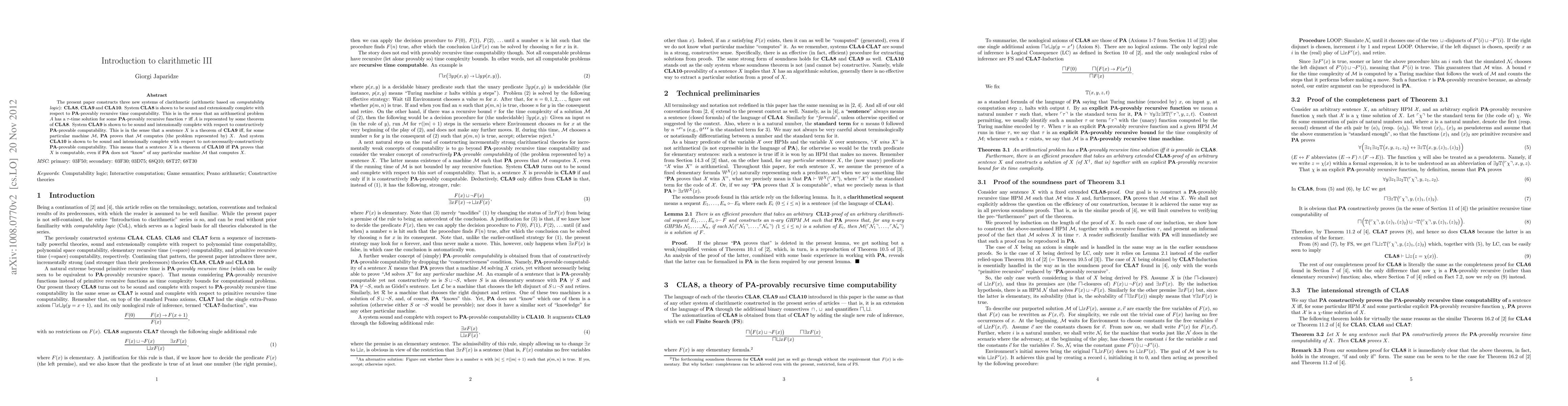 The present paper constructs three new systems of clarithmetic (arithmetic based on computability logic --- see http://www.cis.upenn.edu/~giorgi/cl.html): CLA8, CLA9 and CLA10. System CLA8 is shown to be sound and extensionally complete with respect to PA-provably recursive time computability. This is in the sense that an arithmetical problem A has a t-time solution for some PA-provably recursive function t iff A is represented by some theorem of CLA8. System CLA9 is shown to be sound and intensionally complete with respect to constructively PA-provable computability. This is in the sense that a sentence X is a theorem of CLA9 iff, for some particular machine M, PA proves that M computes (the problem represented by) X. And system CLA10 is shown to be sound and intensionally complete with respect to not-necessarily-constructively PA-provable computability. This means that a sentence X is a theorem of CLA10 iff PA proves that X is computable, even if PA does not "know" of any particular machine M that computes X.