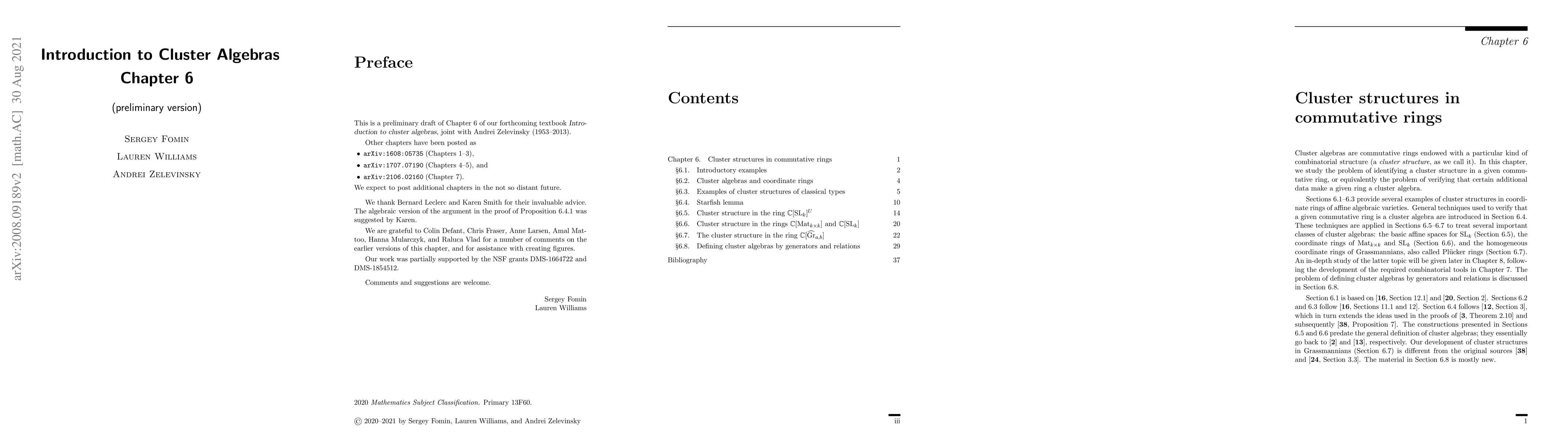 This is a preliminary draft of Chapter 6 of our forthcoming textbook "Introduction to Cluster Algebras." Chapters 1-3 have been posted as arXiv:1608.05735. Chapters 4-5 have been posted as arXiv:1707.07190. This installment contains: Chapter 6. Cluster structures in commutative rings