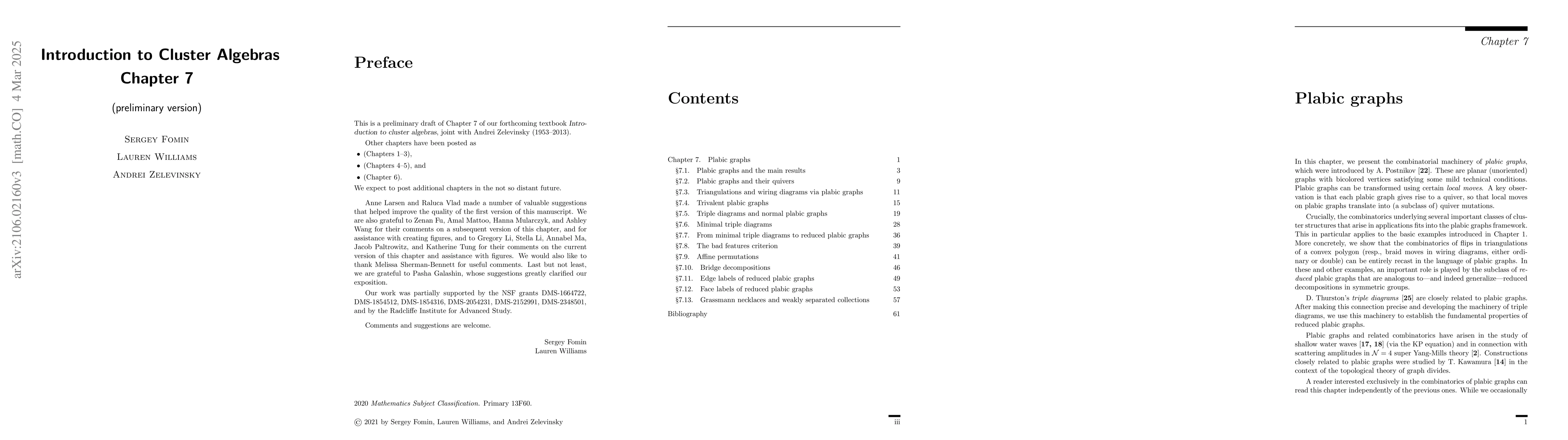 This is a preliminary draft of Chapter 7 of our forthcoming textbook "Introduction to Cluster Algebras." Chapters 1-3 have been posted as arXiv:1608.05735. Chapters 4-5 have been posted as arXiv:1707.07190. Chapter 6 has been posted as arXiv:2008.09189. This installment contains: Chapter 7. Plabic graphs